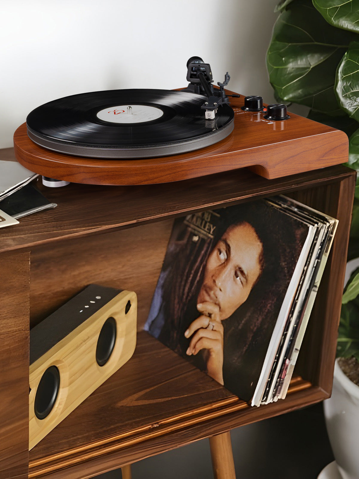 The vinyl turntable designed with 2 Bluetooth connectivity, Bluetooth input and Bluetooth output. You can pair it with your phone or your Bluetooth speakers, Bluetooth headphones, Bluetooth sound bar etc.
