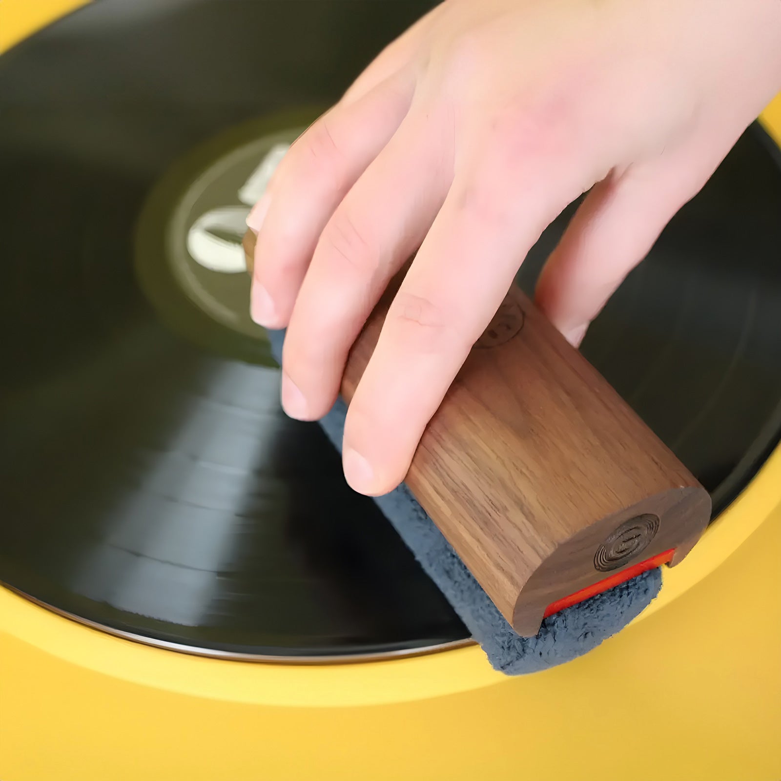 Place the record on the turntable, place the professional cleaning brush on the turntable at a 45-degree angle, start from the center, and slowly and gently pull outwards. (Can be used with detergent).