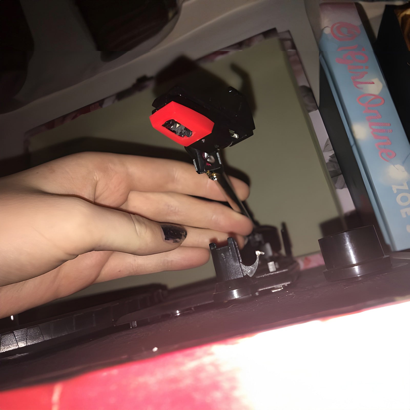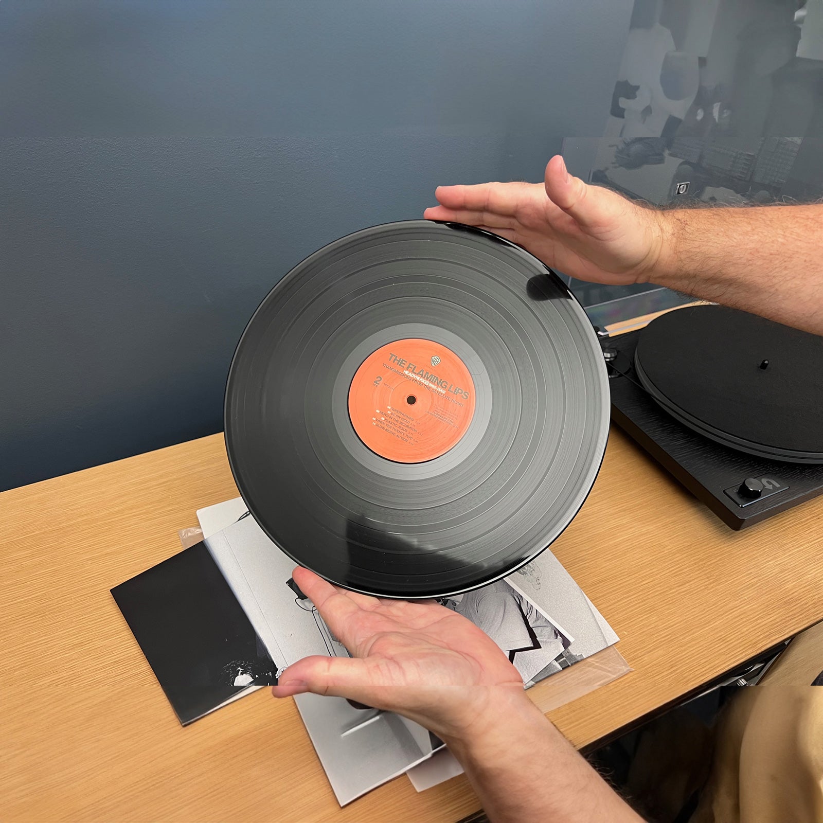 Take out the record along the edge, hold the edge of the record with your thumb, place your other fingers on the middle paper circle, keep your palm free, and take out the inner sleeve with the other hand. Hold the edge of the record between the palms of both hands and keep the gesture on the turntable without touching the groove.