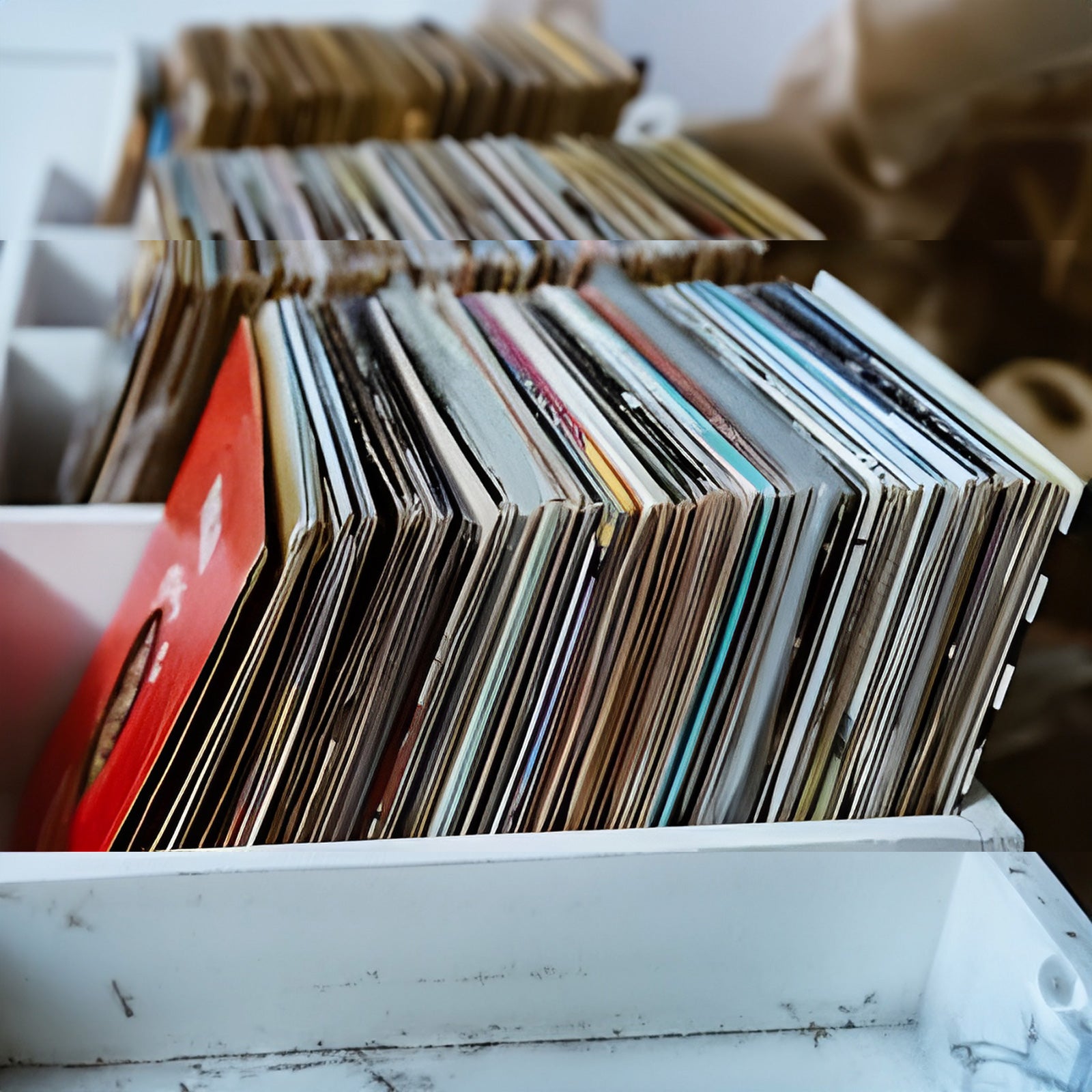 Place them vertically, in a row, in a cool and dry place. Replace the record jacket and inner sleeve regularly and keep them clean.