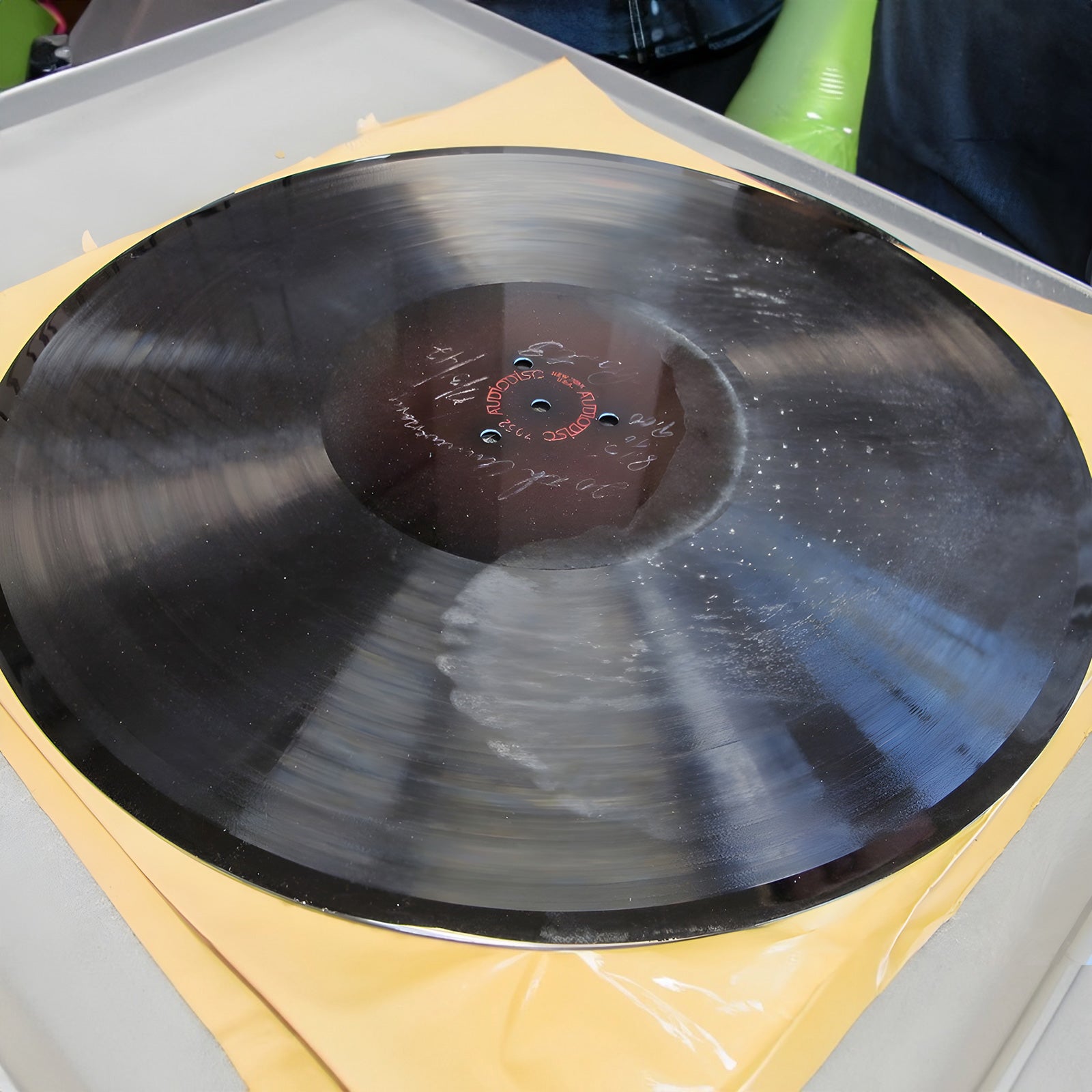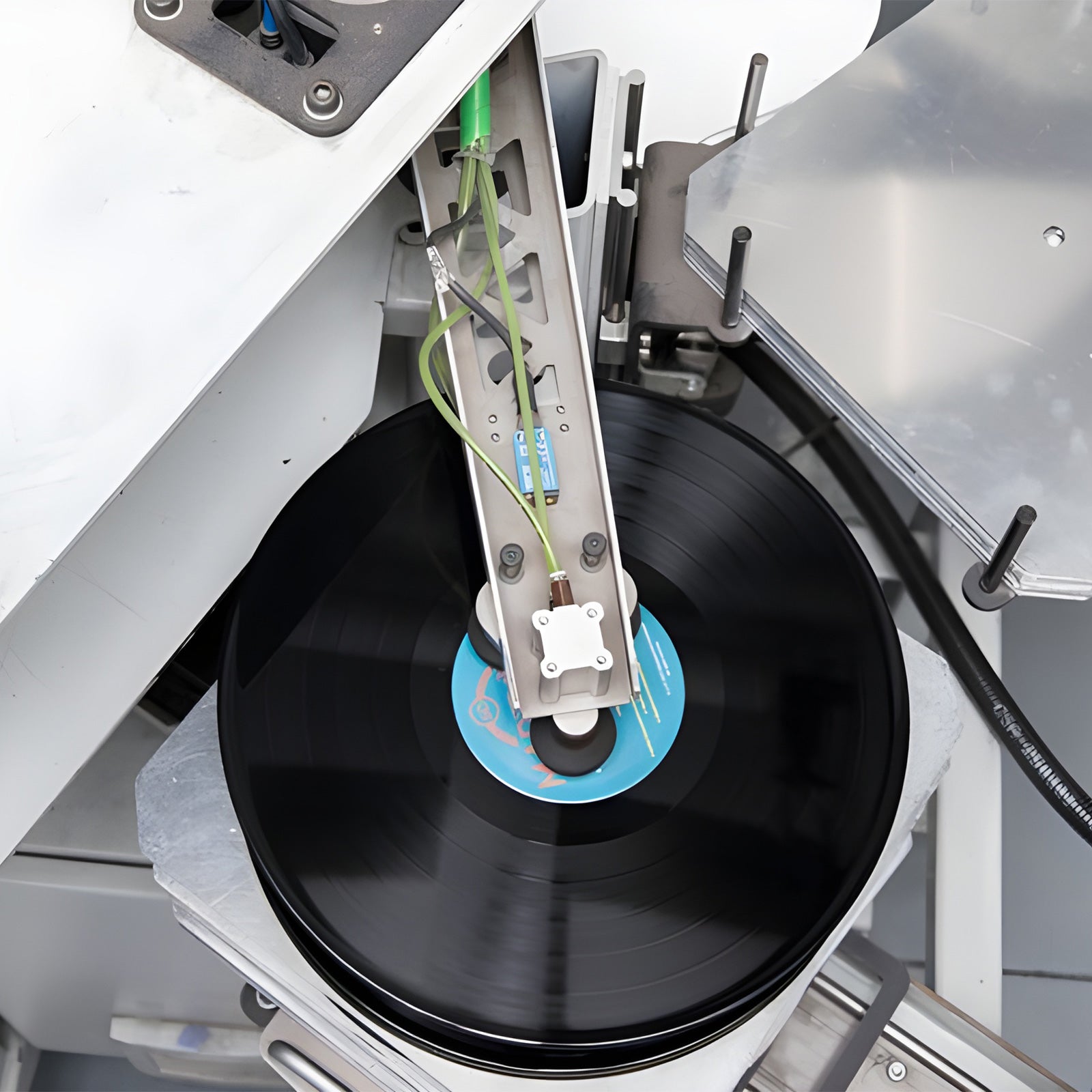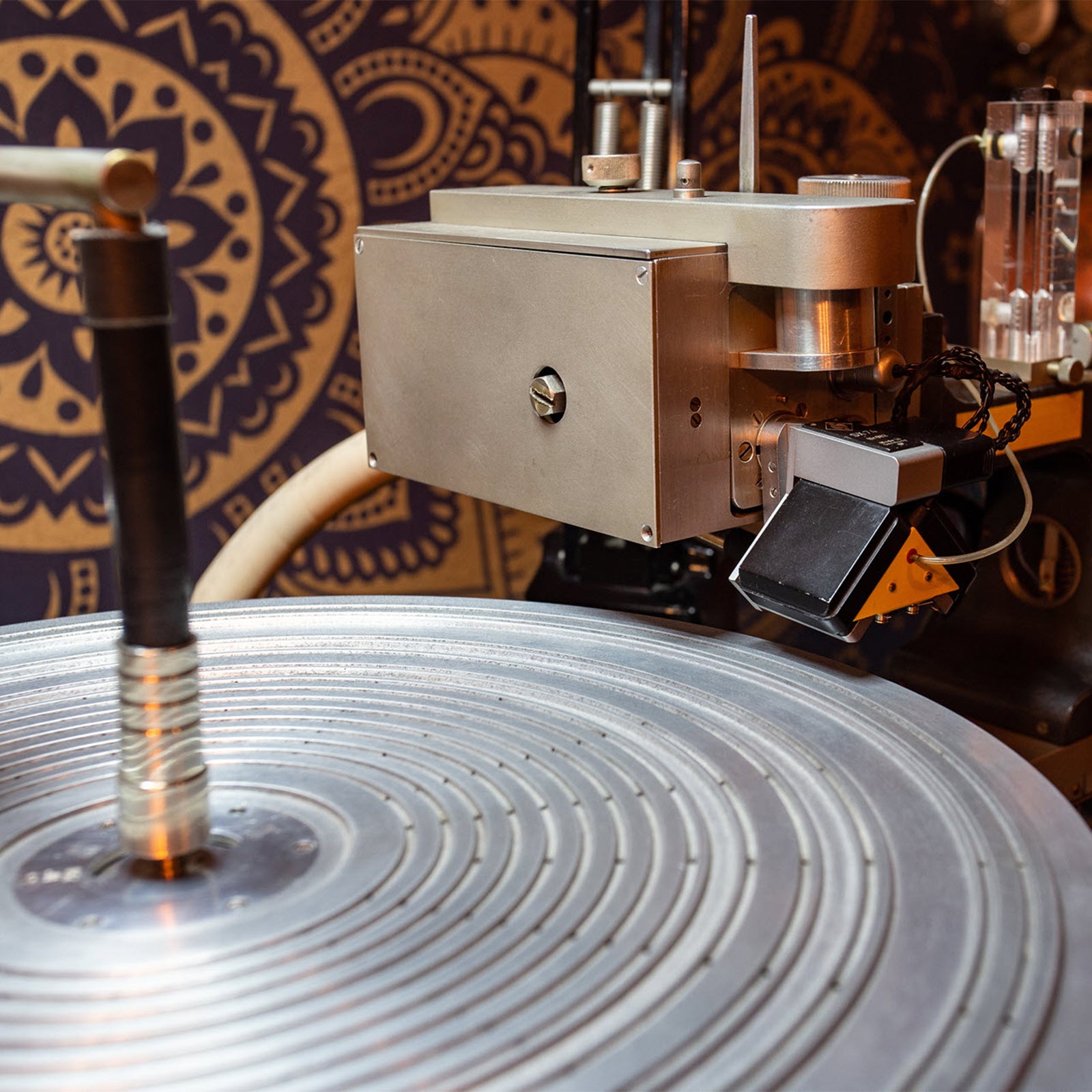 Using a cutting machine, carve grooves into the paint disk to create the master tape.