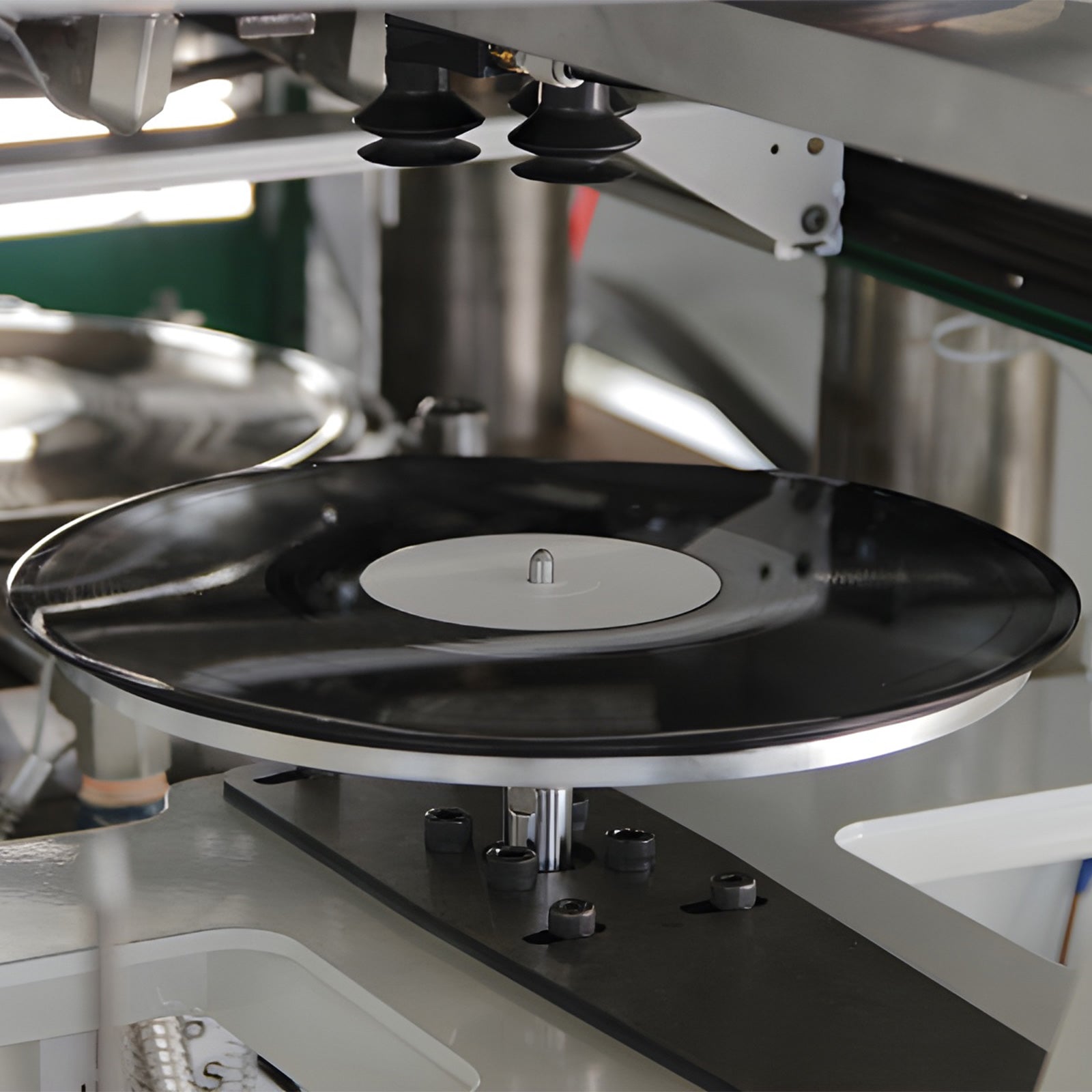 Hot soft vinyl is pressed with a stamp, which transfers the grooves to the vinyl surface of the record.