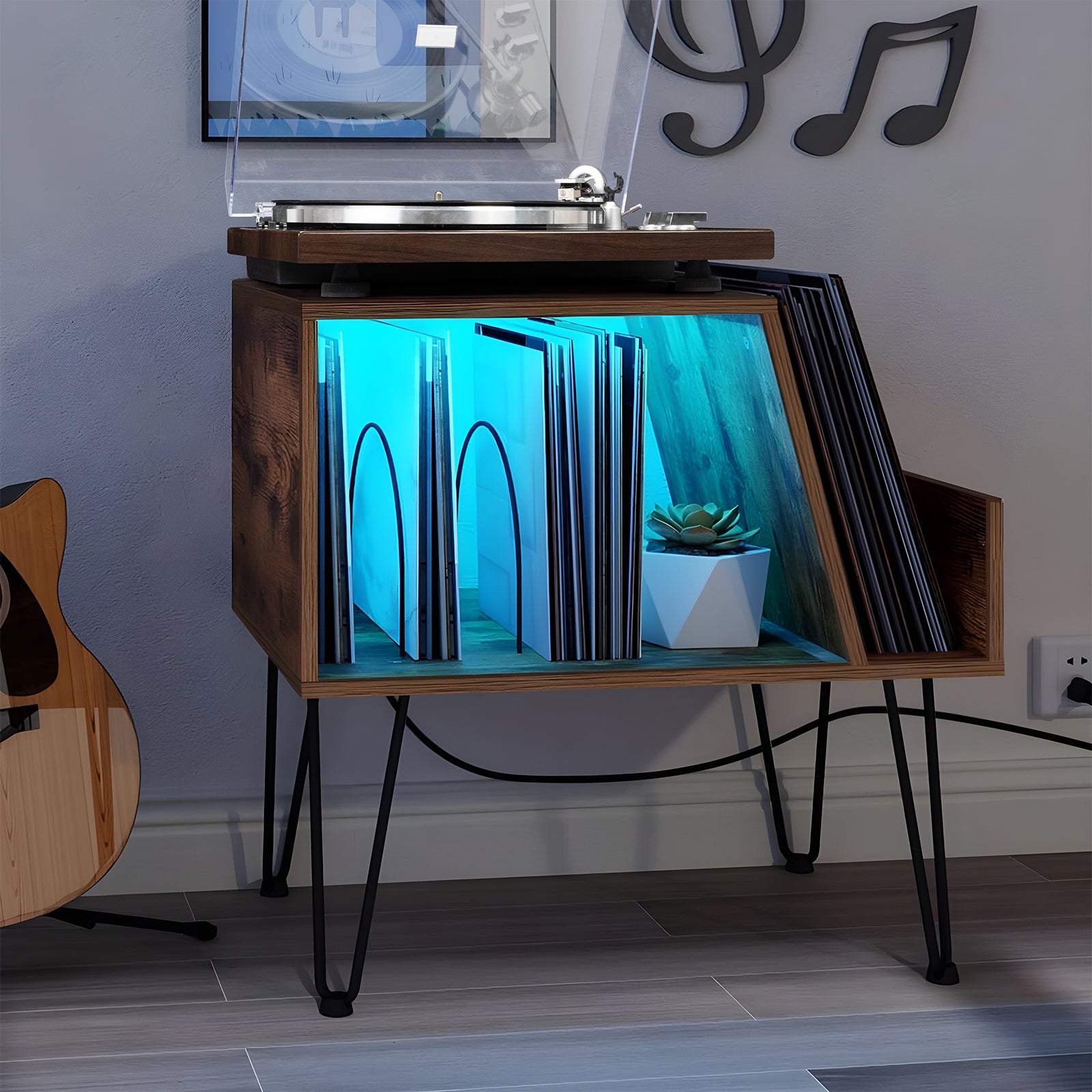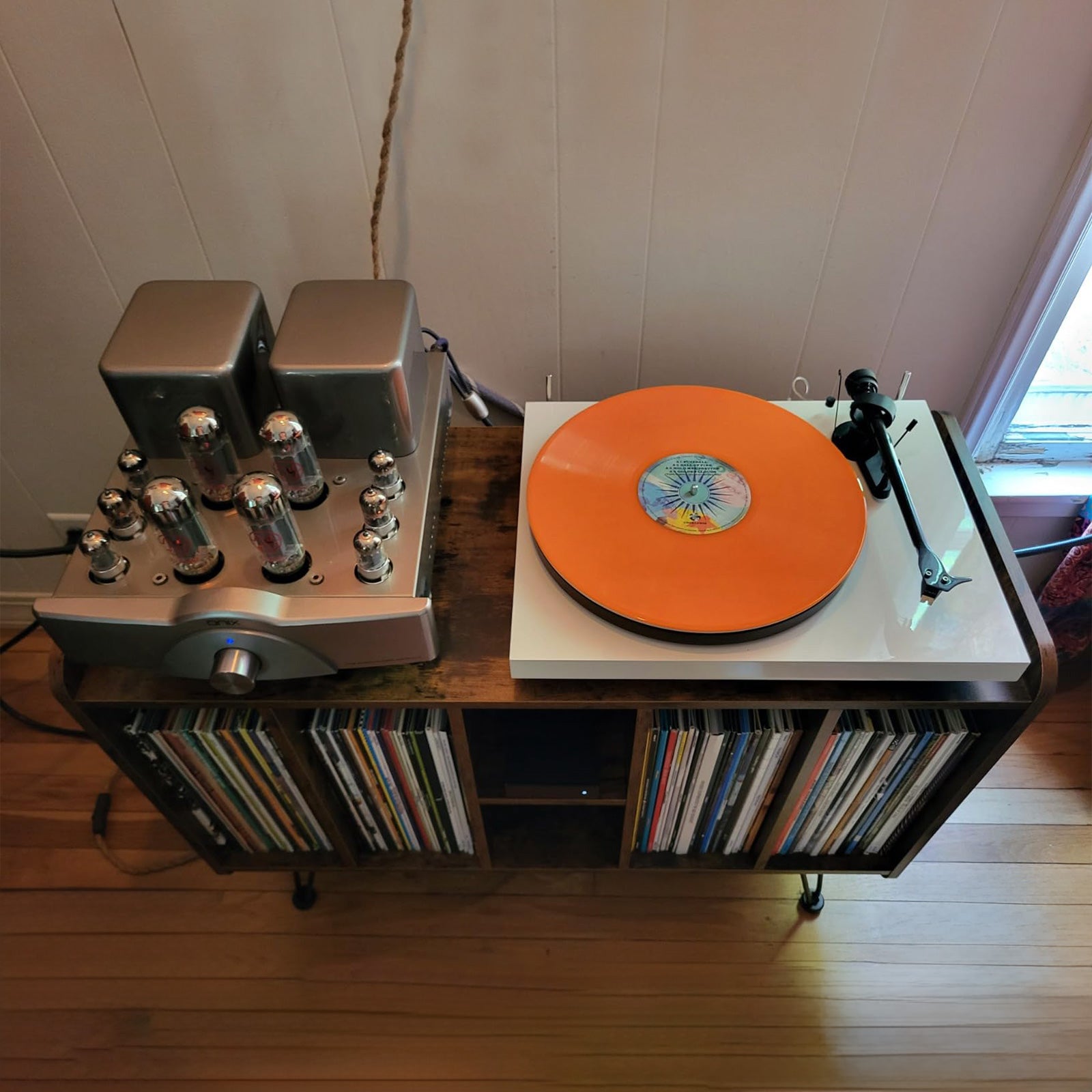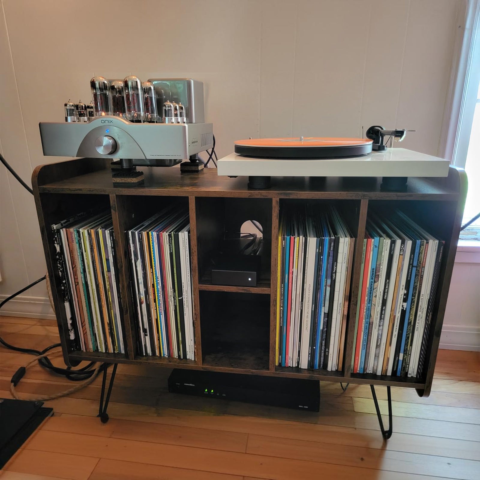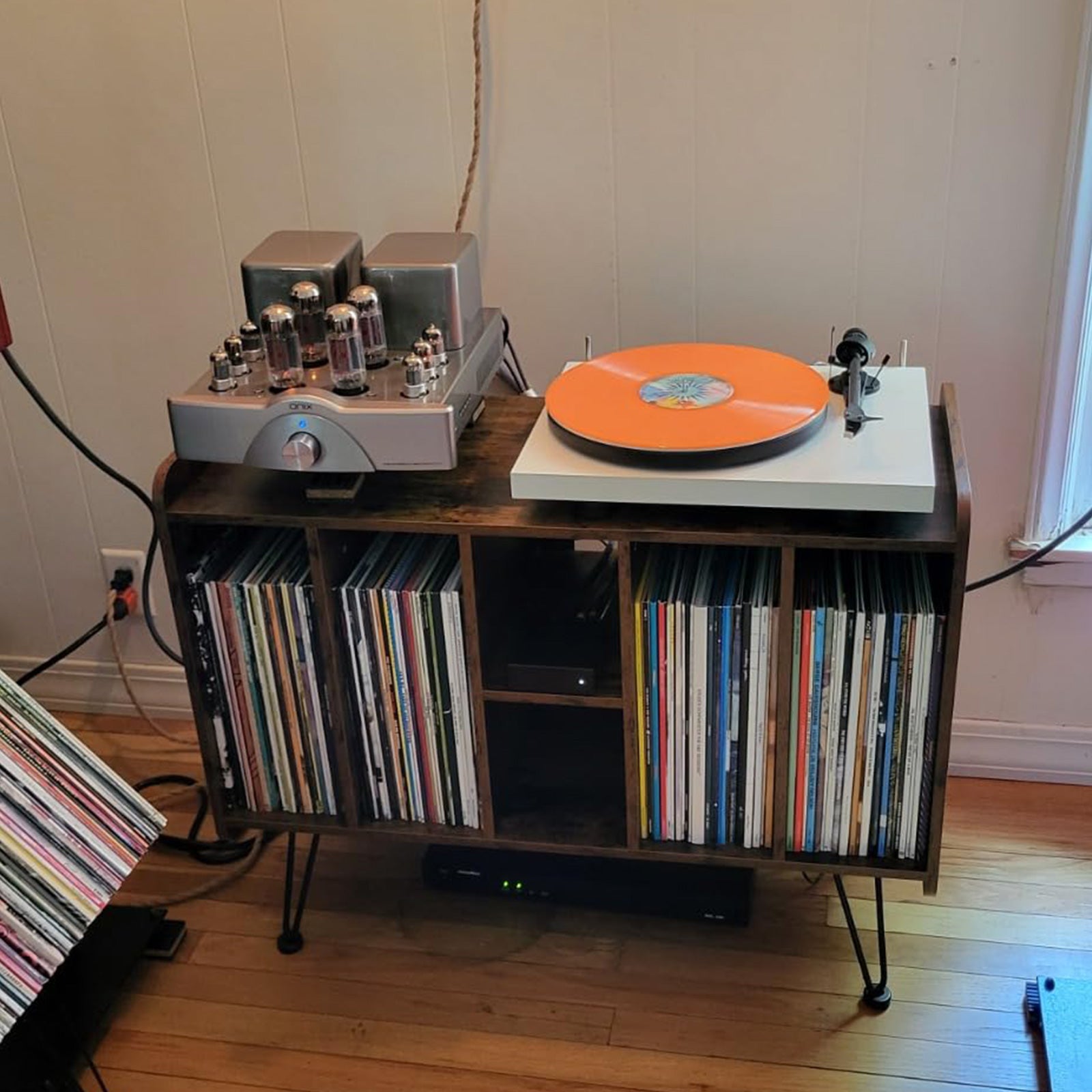 This stand is exactly what I needed. It fits perfectly in my studio and keeps all my records and accessories in one place. The sound quality has noticeably improved too!