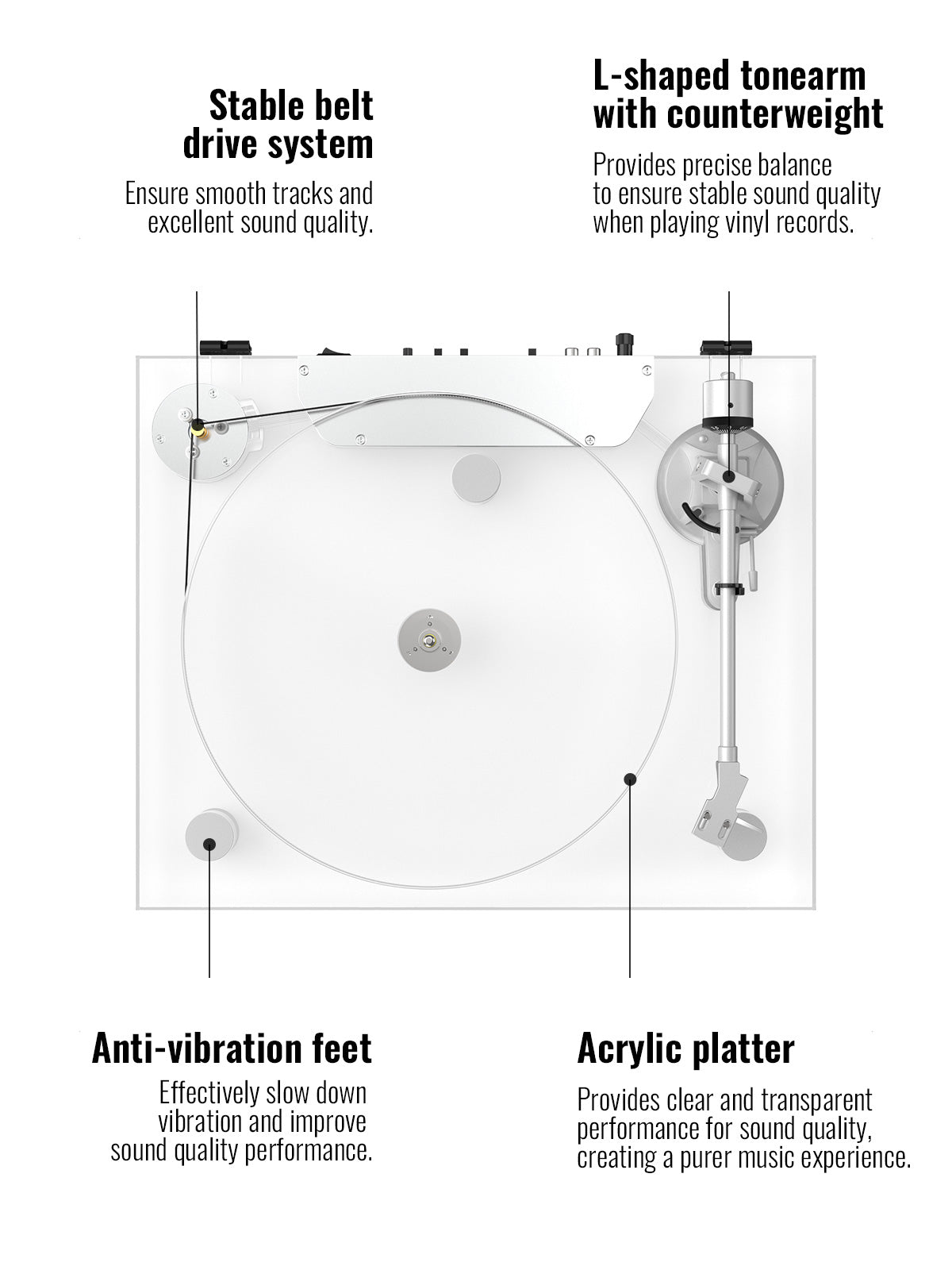 The fully manual belt drive system ensures stable playback of records and high-fidelity sound quality. This traditional driving method provides you with a purer and more realistic audio experience, allowing you to deeply immerse yourself in the music.
