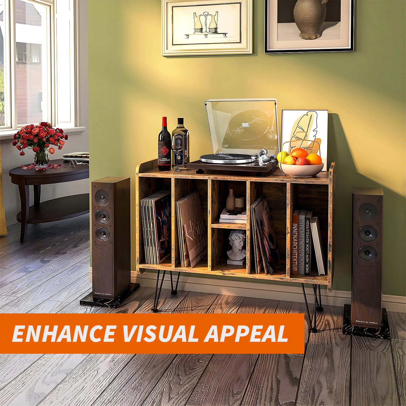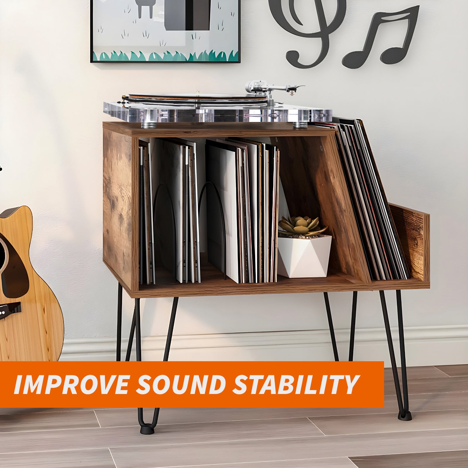 Our record player stand is engineered to provide exceptional stability, reducing vibrations that can distort sound quality. By offering a solid and secure platform, the stand ensures smoother playback and enhances the overall audio experience. This stability is crucial for achieving clear and precise sound reproduction, allowing you to enjoy your vinyl records as the artists intended.