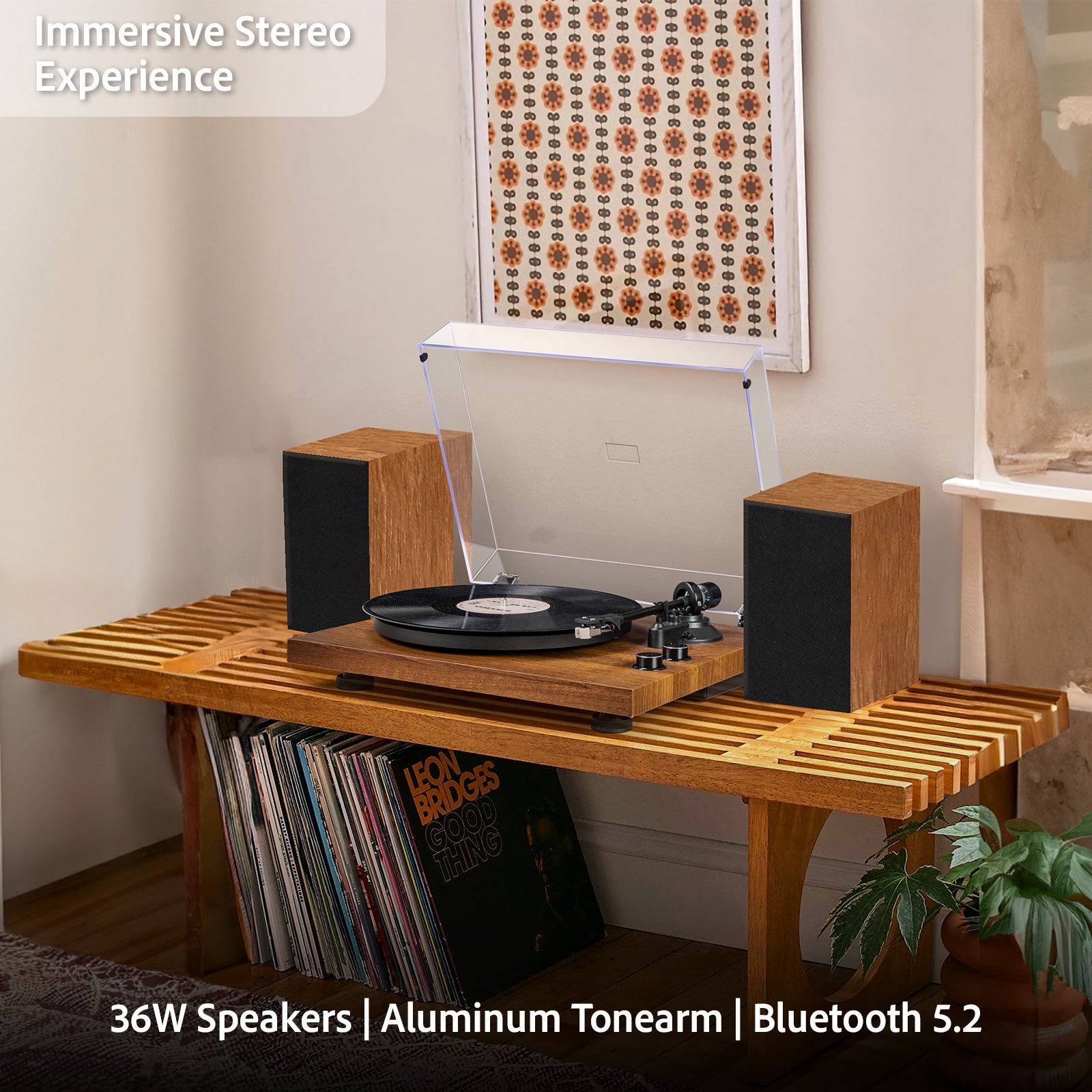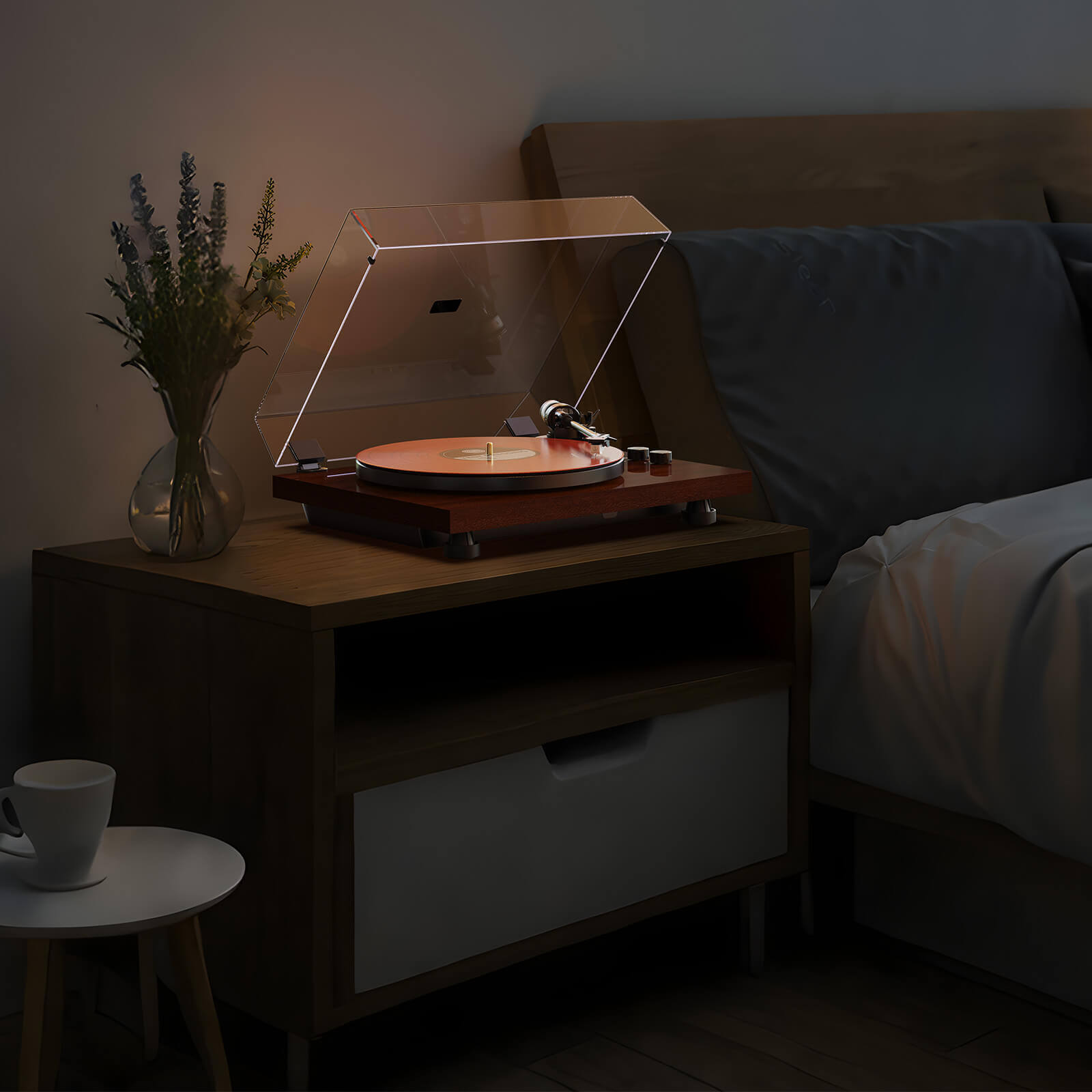 Crystal-clear full-acrylic body | Upgraded motor & vibration control | Bluetooth output for wireless listening | Audiophile-grade cartridge & aluminum tonearm | A centerpiece for any modern home