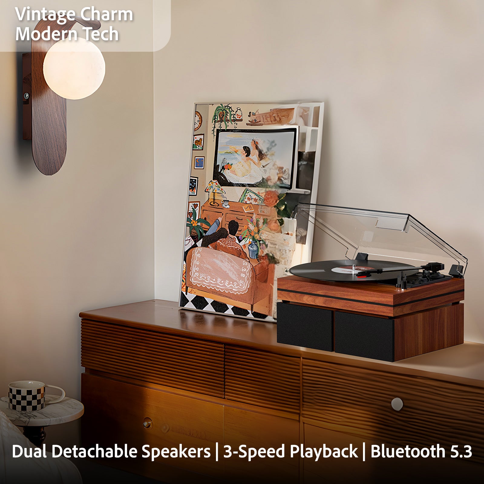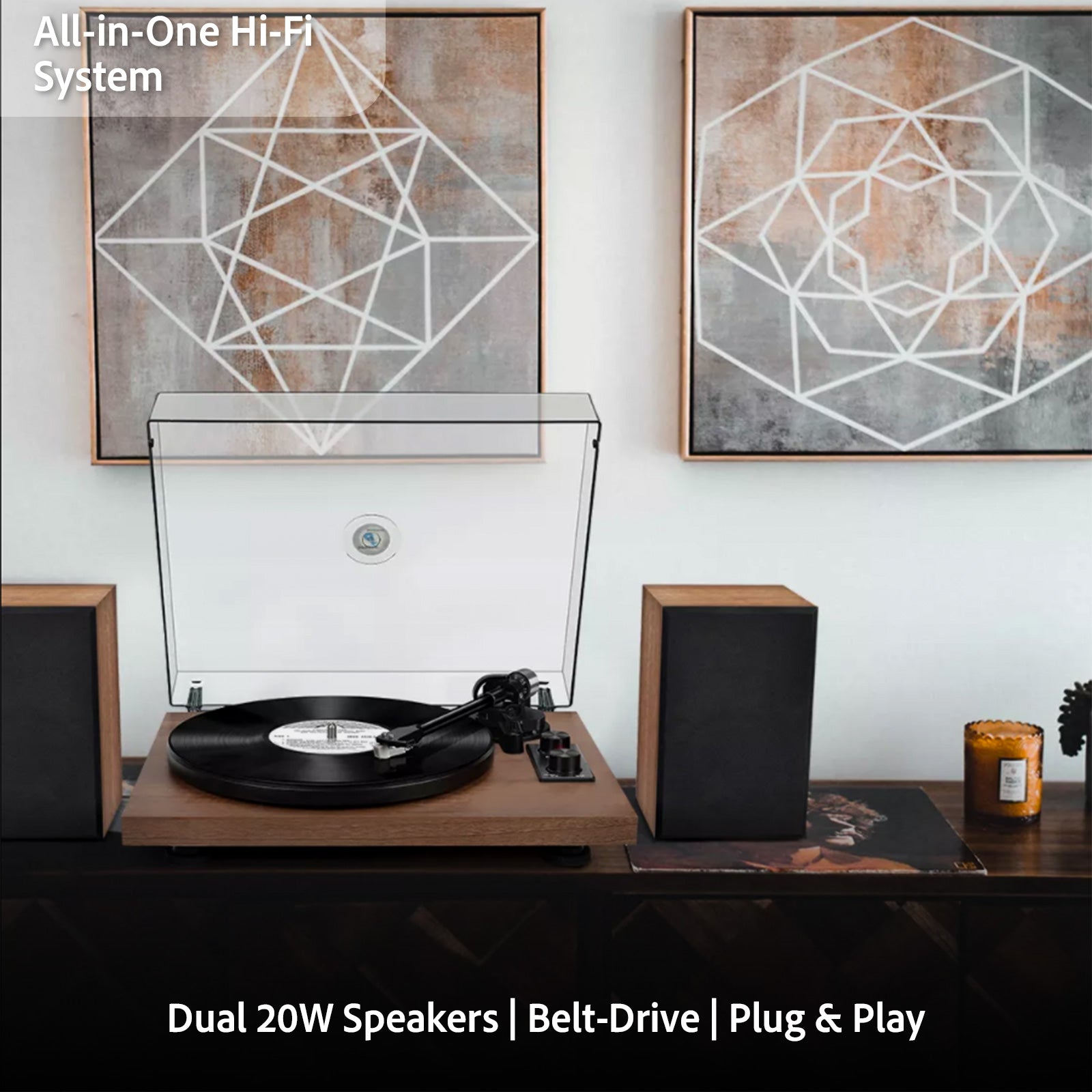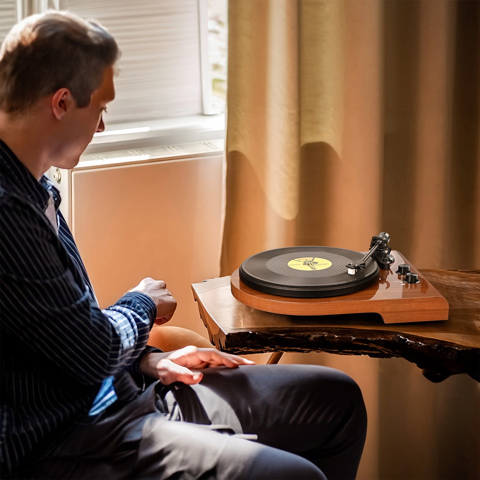 Perfect for beginners upgrading to real hi-fi sound. Warm wood texture, stable metal platter, built-in phono preamp.