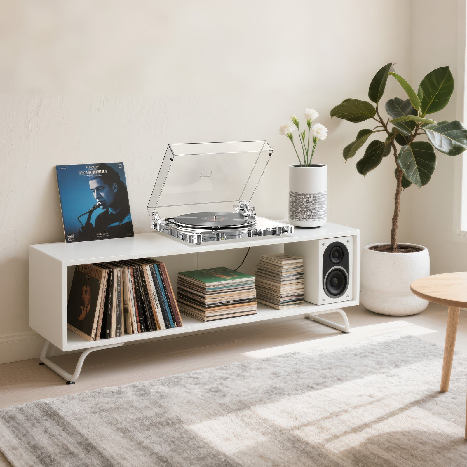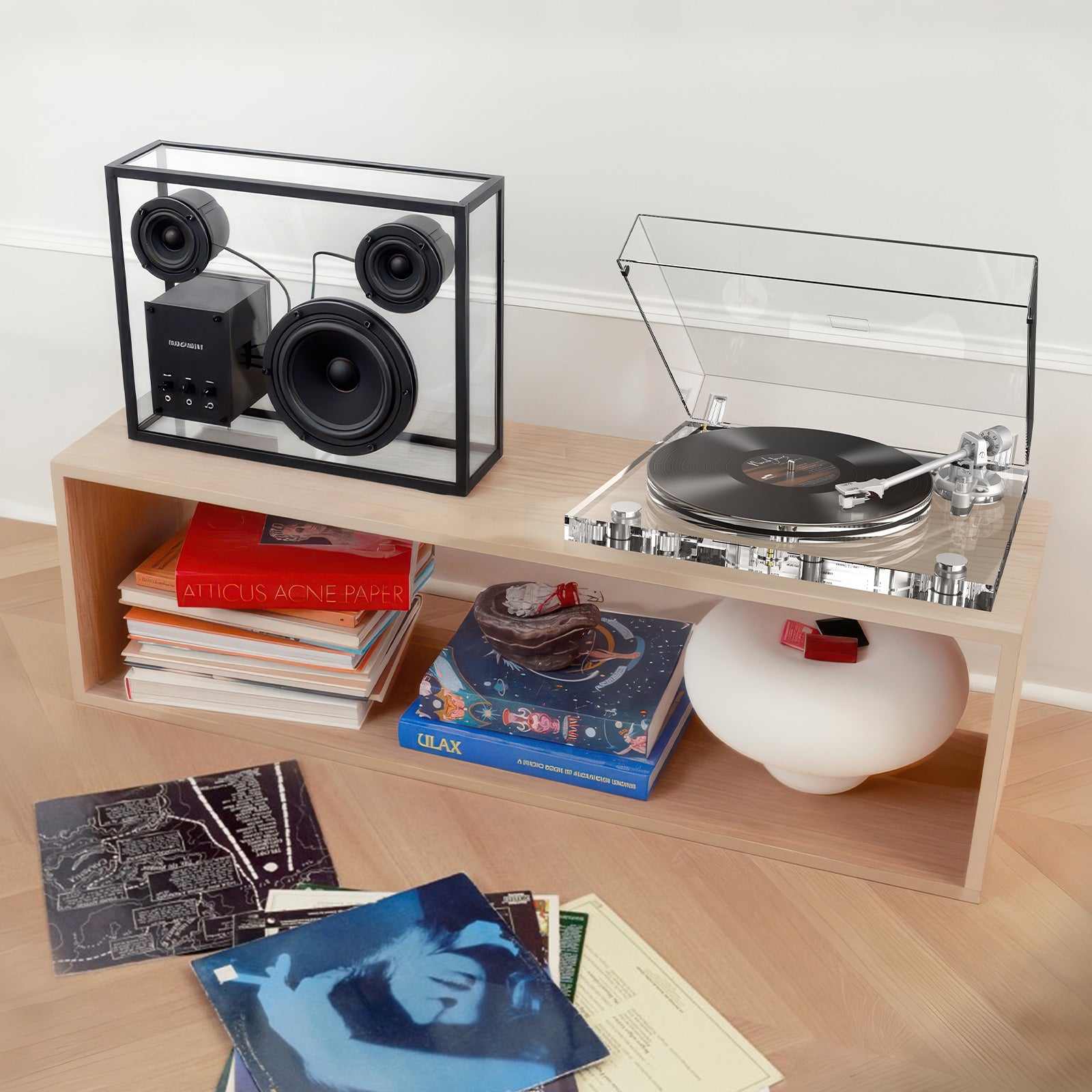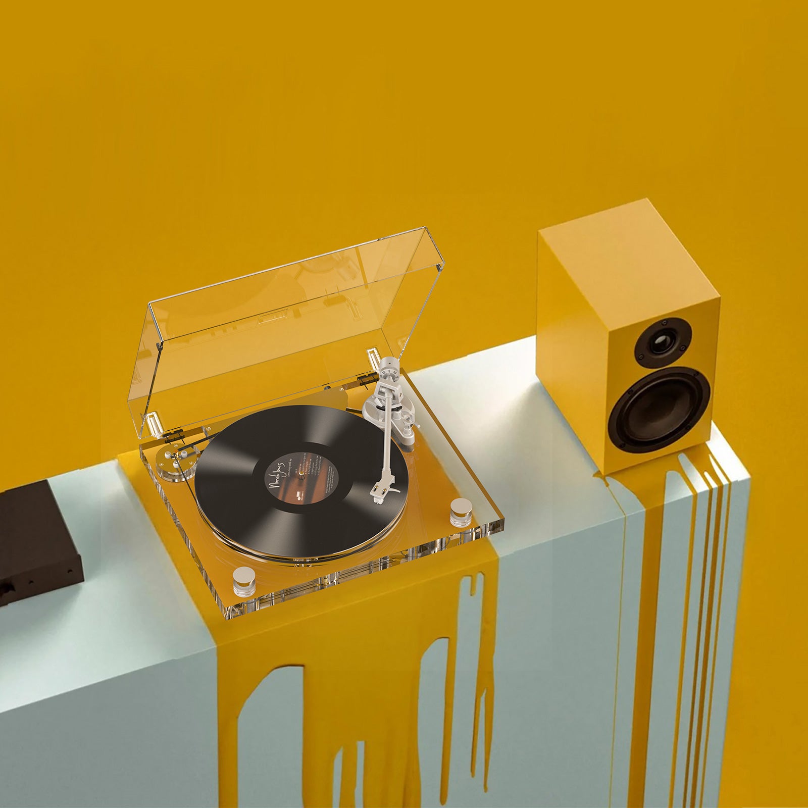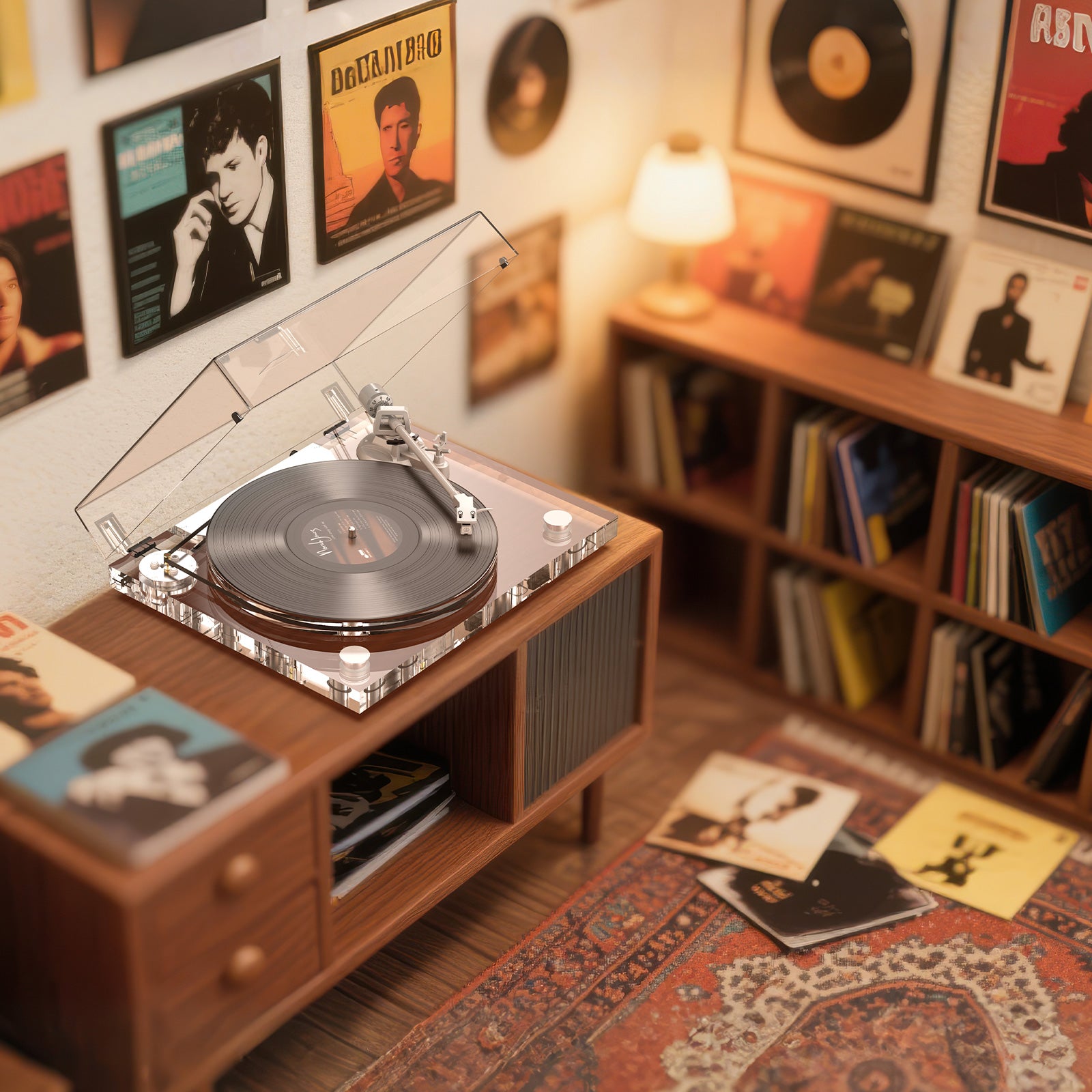 The fully transparent ICE1-V2 looks stunning on a sleek, minimalist desk or console. Pair it with a few carefully curated vinyl sleeves on a floating shelf above or stacked neatly beside it. A small potted plant or desk lamp adds a touch of warmth and dimension — perfect for your Instagram feed.