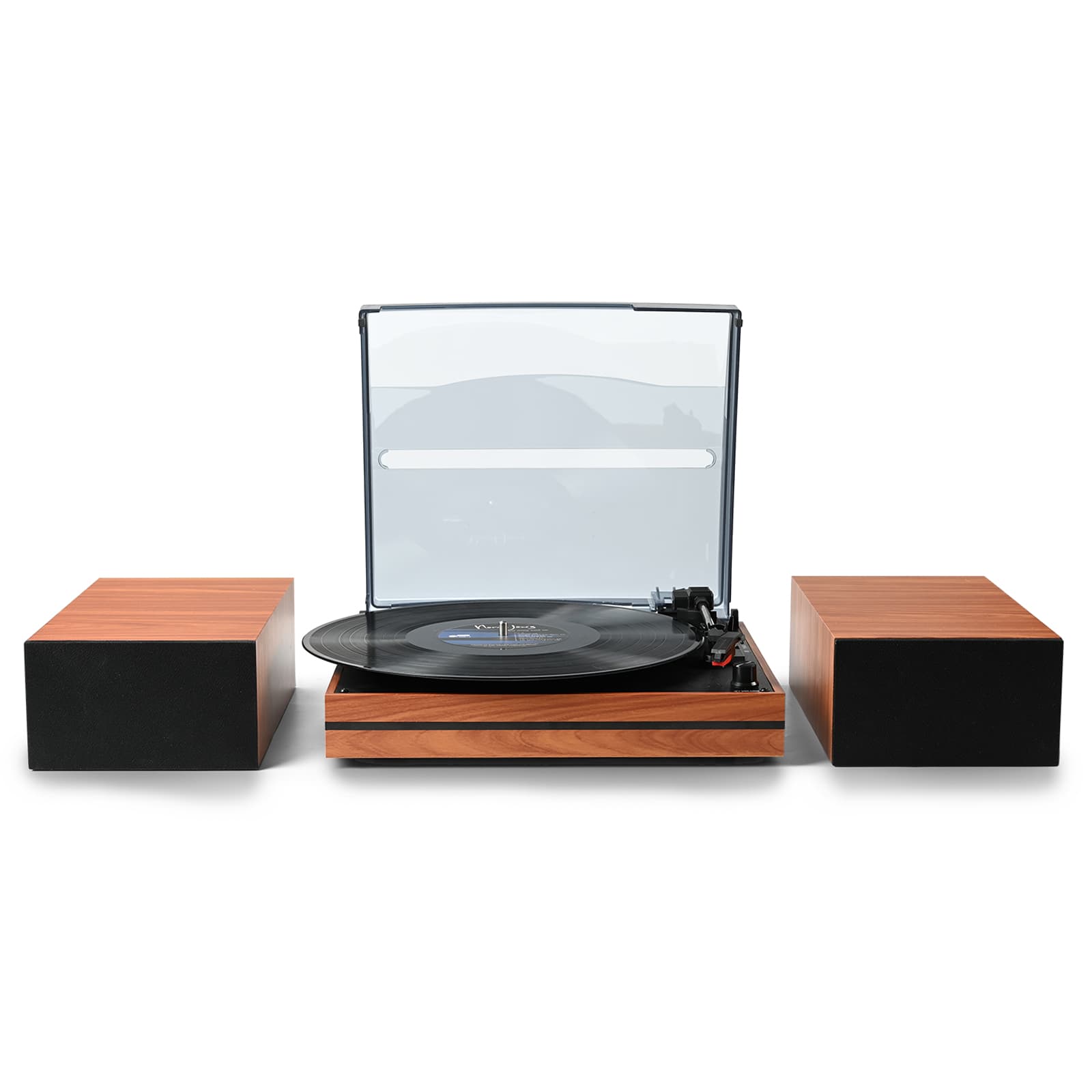 An affordable turntable speaker system with wood design turntable and a pair of 30 watts speakers.