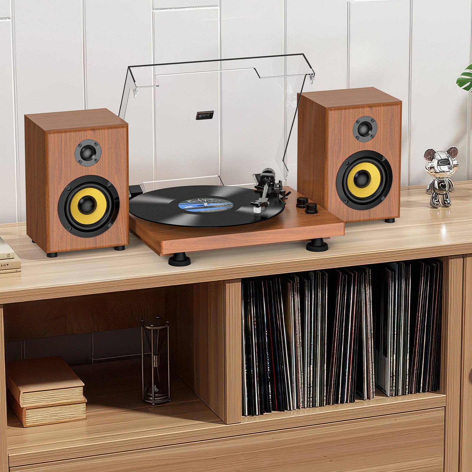 The setup is easy and straightforward—just plug in the turntable, connect the speakers, and pair your Bluetooth devices. No complex wiring is required.