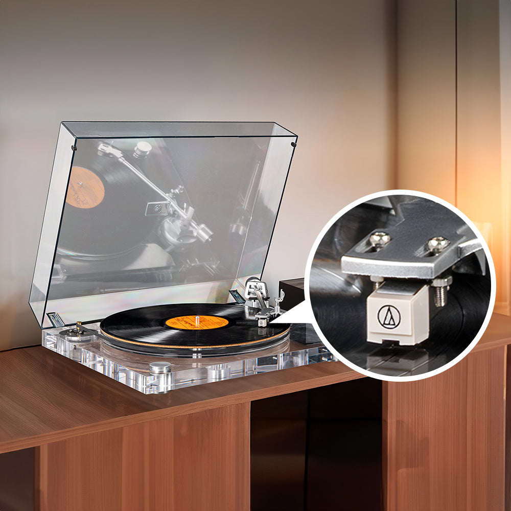 The 25mm acrylic chassis minimizes vibration, while the DC motor with speed-sensor ensures flawless platter rotation. The transparent acrylic platter adds both style and stability, and the aluminum alloy tonearm with adjustable VTA ensures perfect tracking.