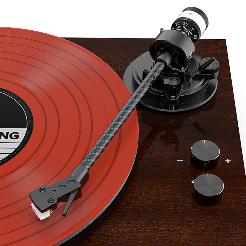 The precision-engineered carbon fiber tonearm offers accurate tracking with excellent vibration resistance, ensuring unmatched audio clarity. With adjustable counterweight and anti-skating, it delivers flawless playback every time.