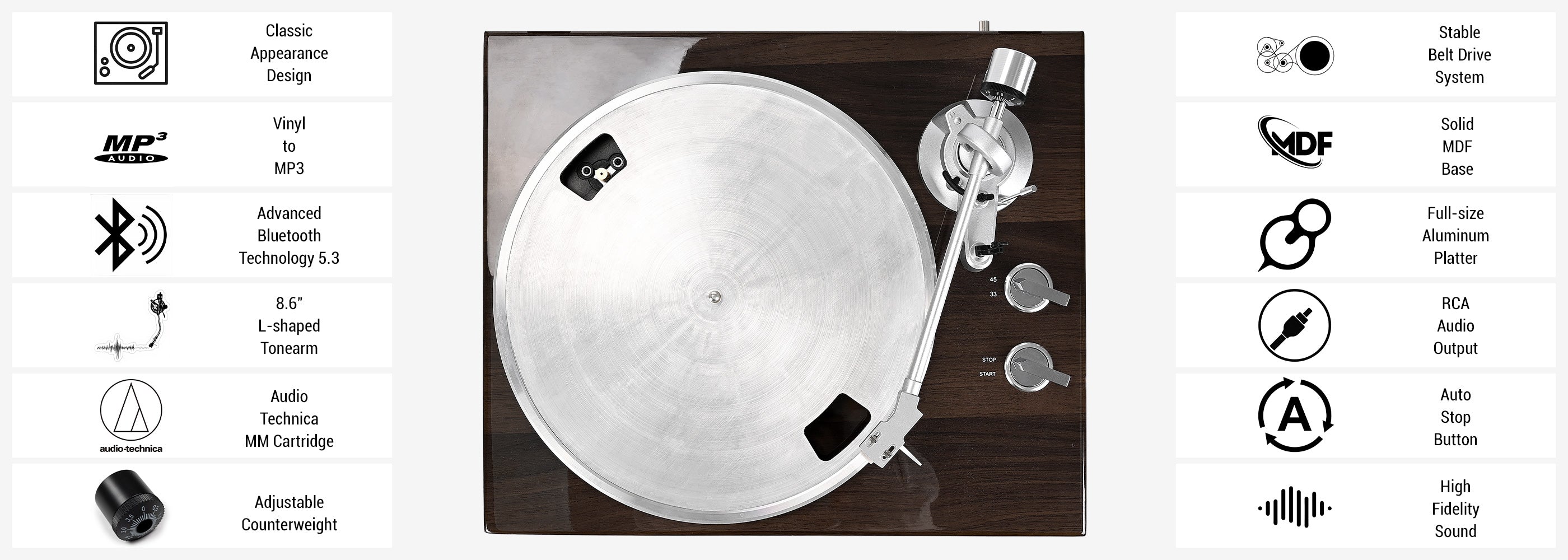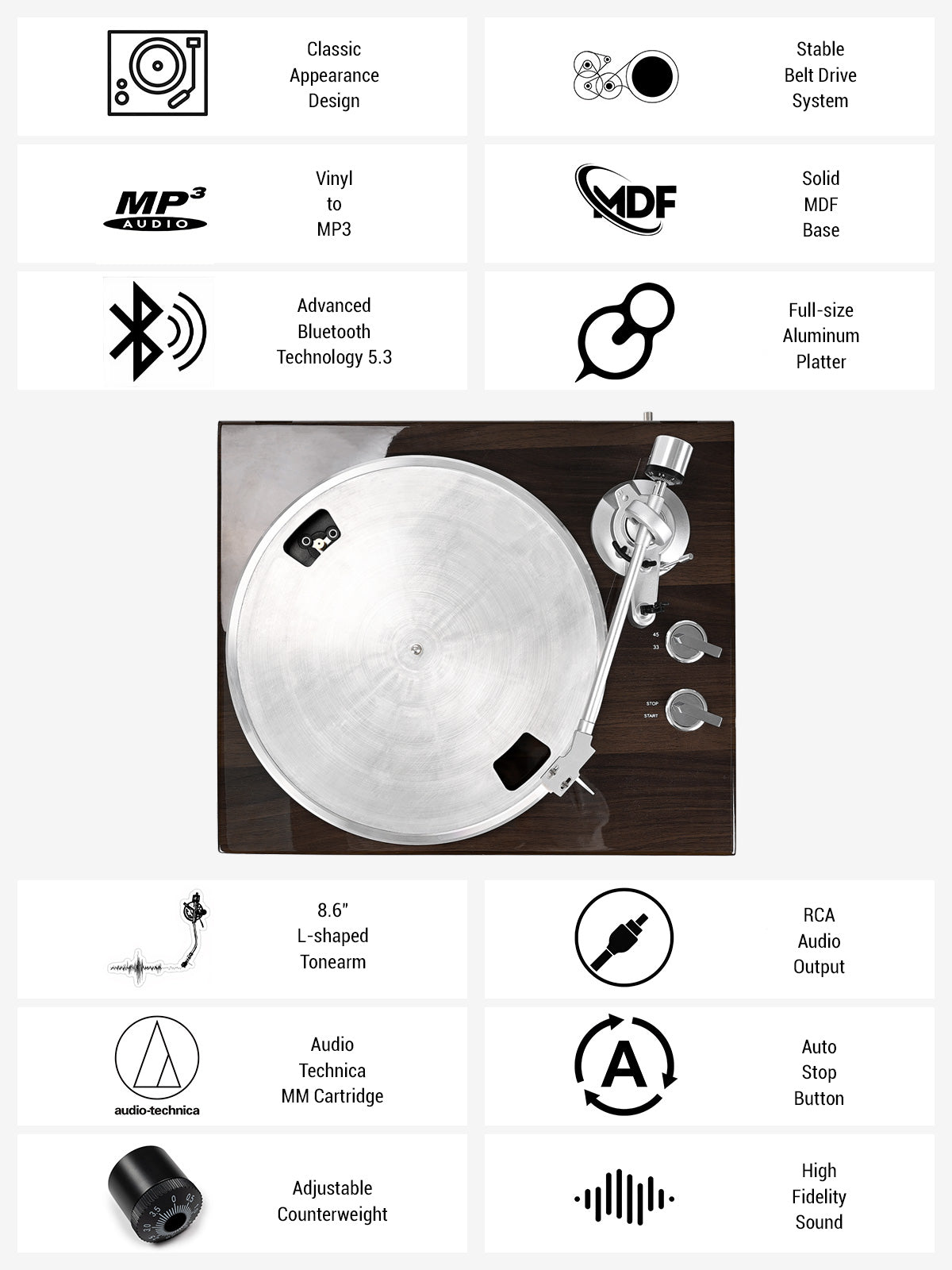 - The belt drive system ensures smooth rotation of records, providing a high-quality music experience.