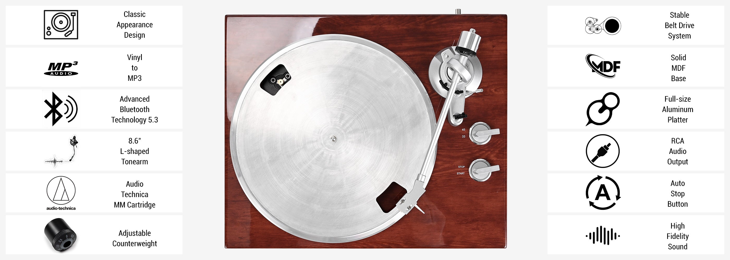 Featuring an aluminum L-shaped 8.6" tonearm, the HQKZ-006 ensures precise tracking and optimal stylus contact with your vinyl records. This design choice contributes to the turntable's ability to deliver a faithful reproduction of the original recording.