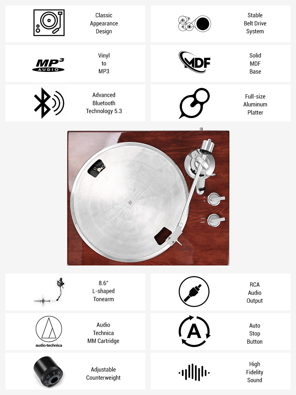 Its sophisticated belt drive system maintains high fidelity of sound quality; the solid MDF base and aluminum turntable effectively reduce vibration and resonance, providing clearer and stable sound quality; the dual speed adjustment function provides users with a wider range of music choices.