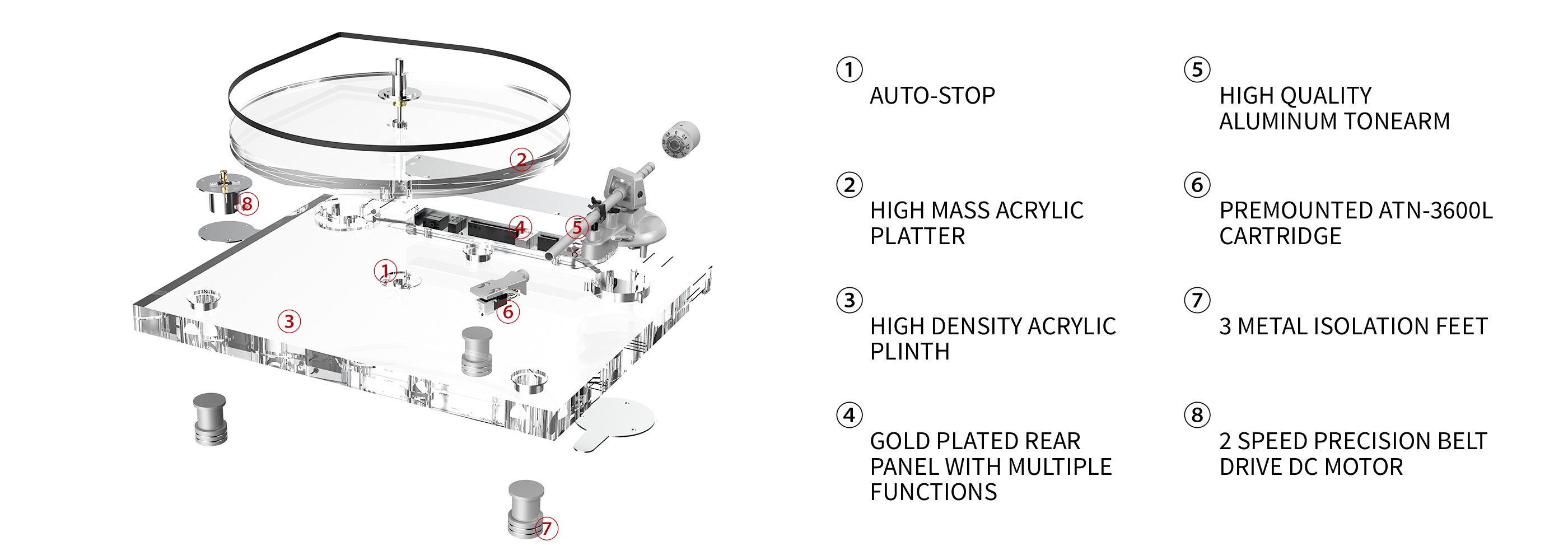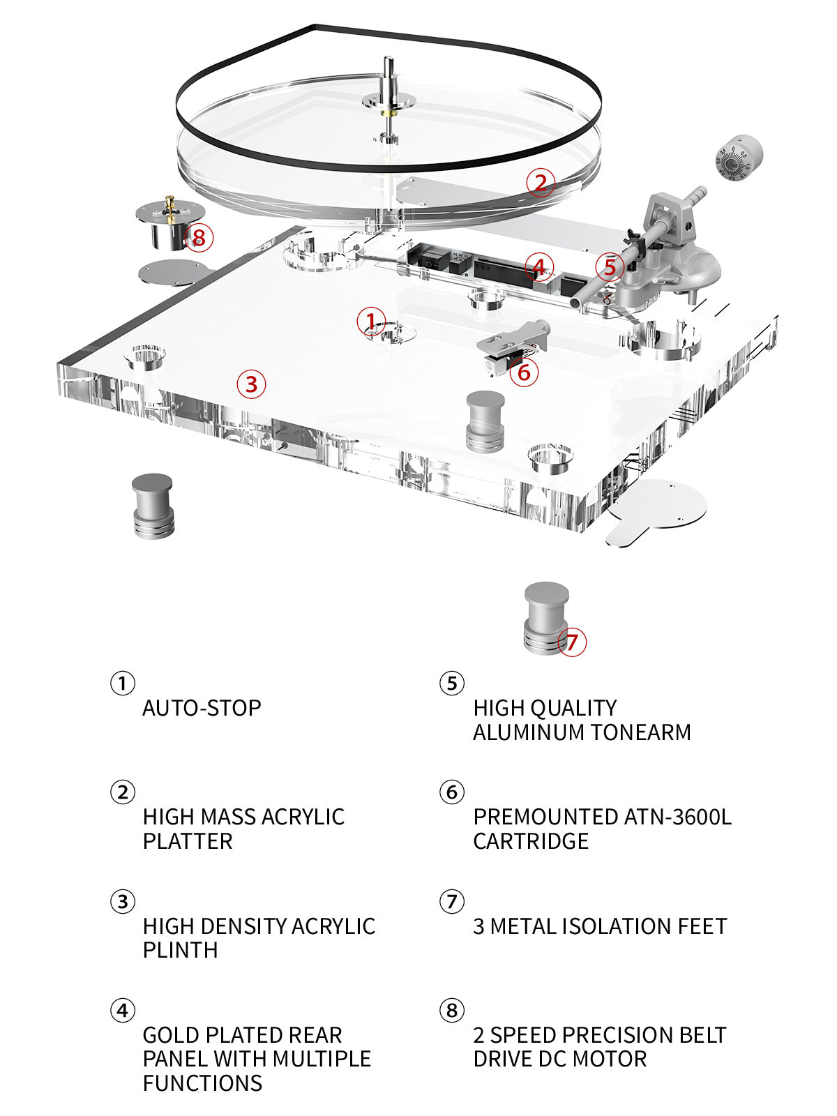 Solid mass-loaded 25mm acrylic chassic reduces resonance and absorbs vibrations from the motor and listening environment.