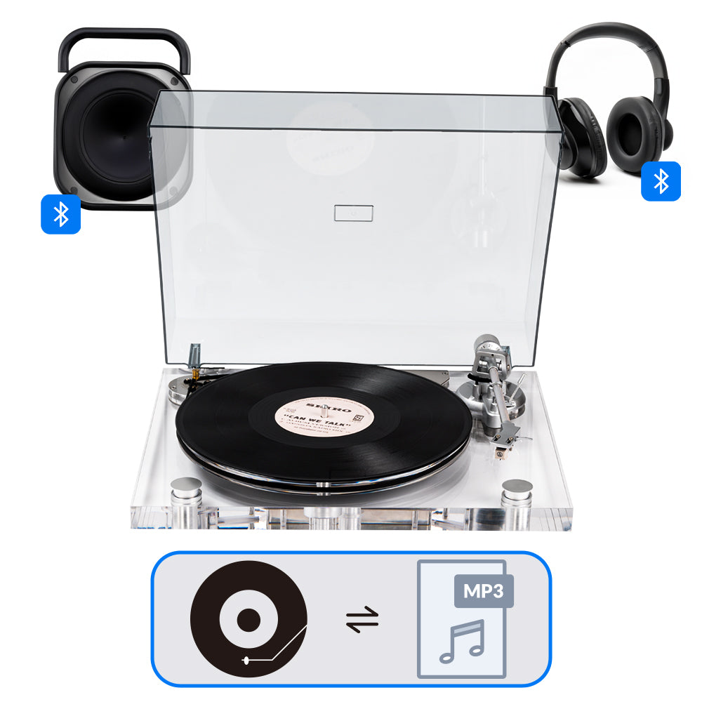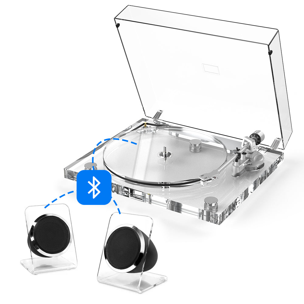 A Bluetooth output on a turntable allows you to wirelessly send the audio signal from your vinyl records to Bluetooth-enabled devices like headphones, speakers, or sound systems. - Acrylic Platter