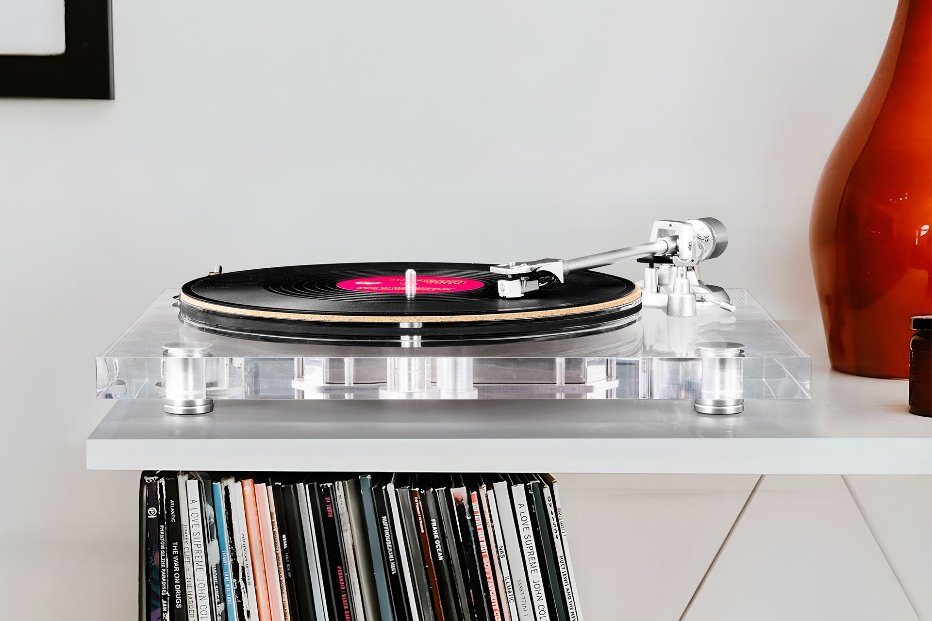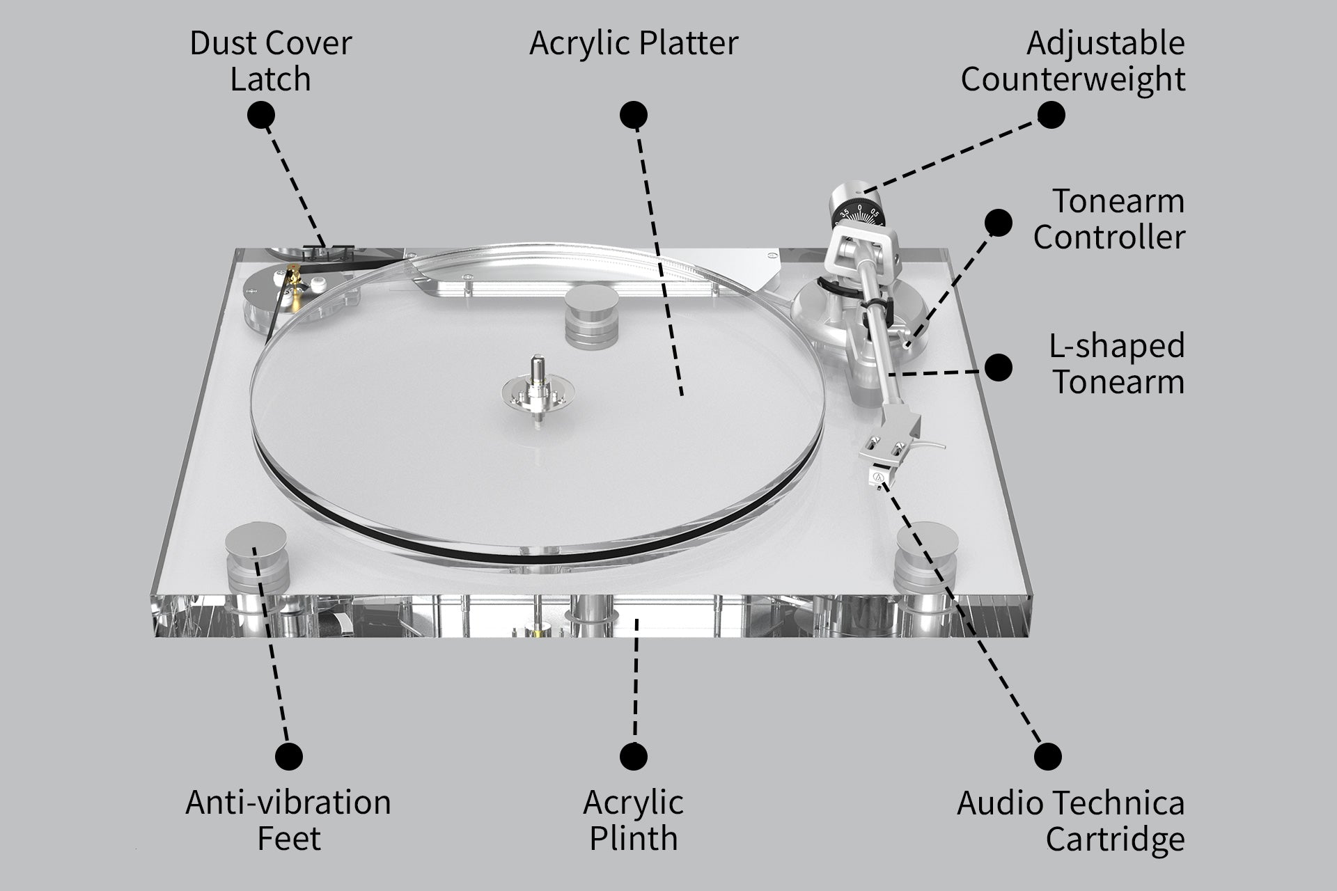 - Transparent 15mm-thick acrylic platter for stable rotation.