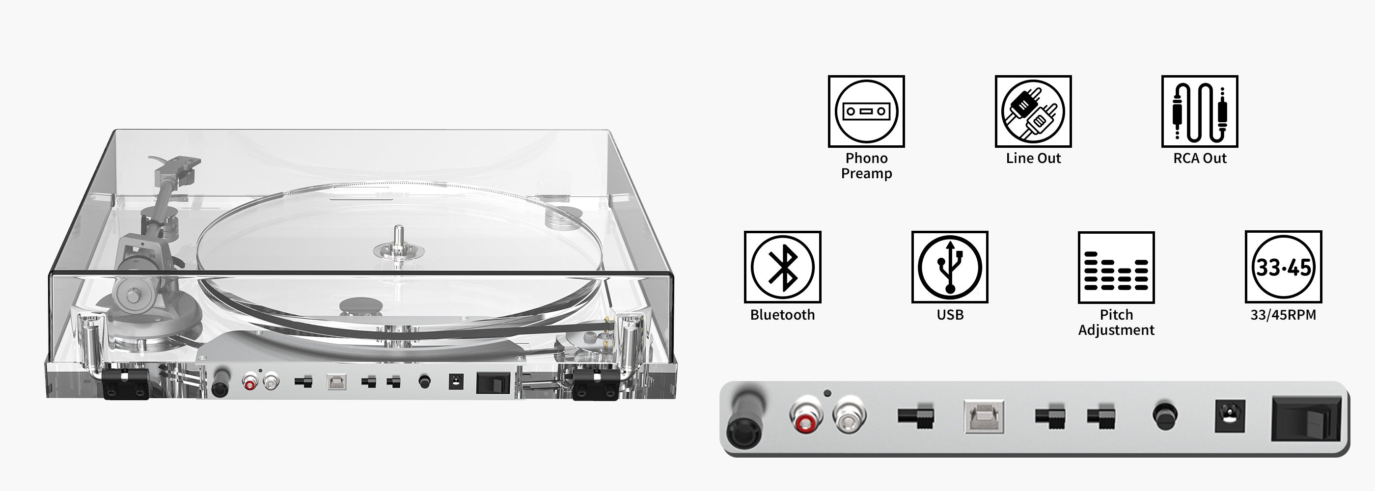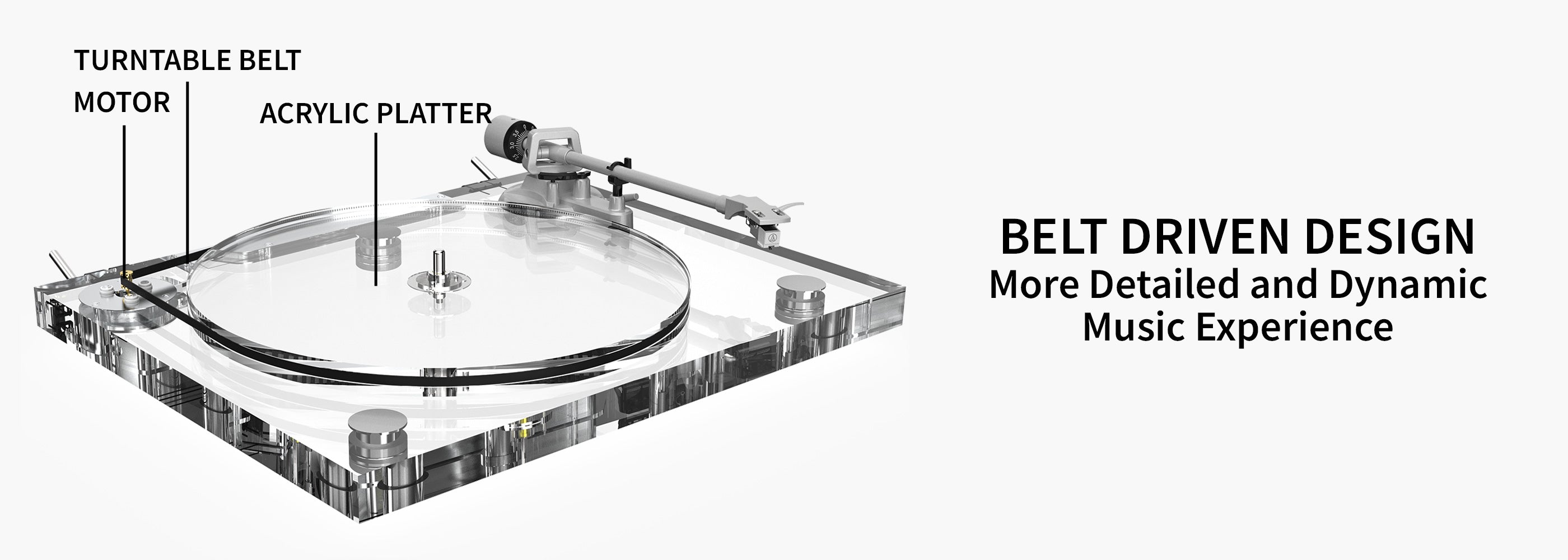 - Grooved Acrylic Platter: Enhances speed consistency, while the aluminum spindle and seamless silicone belt ensure stability.