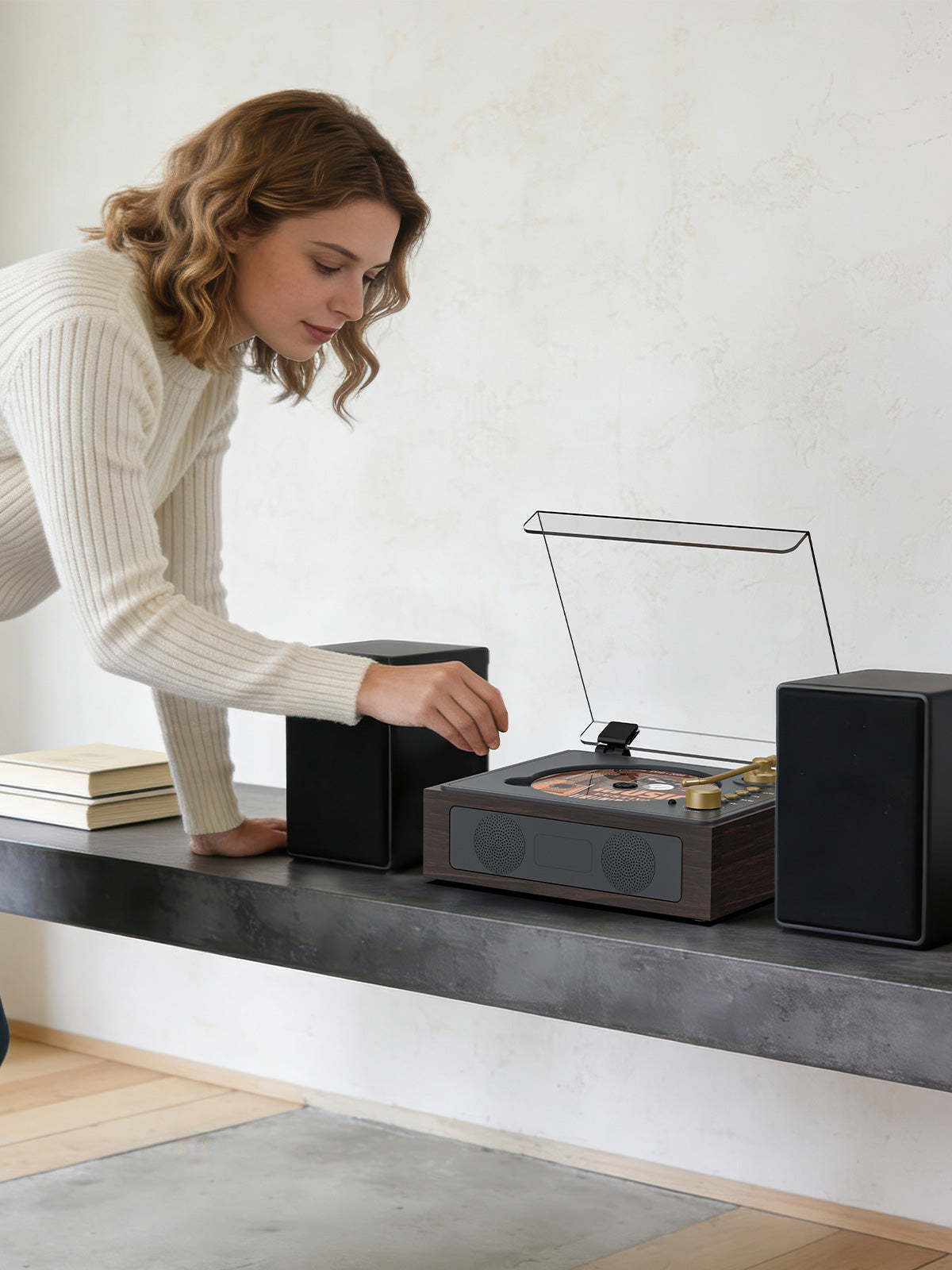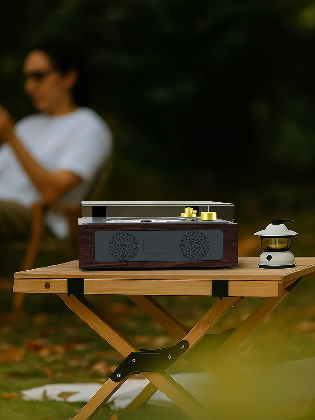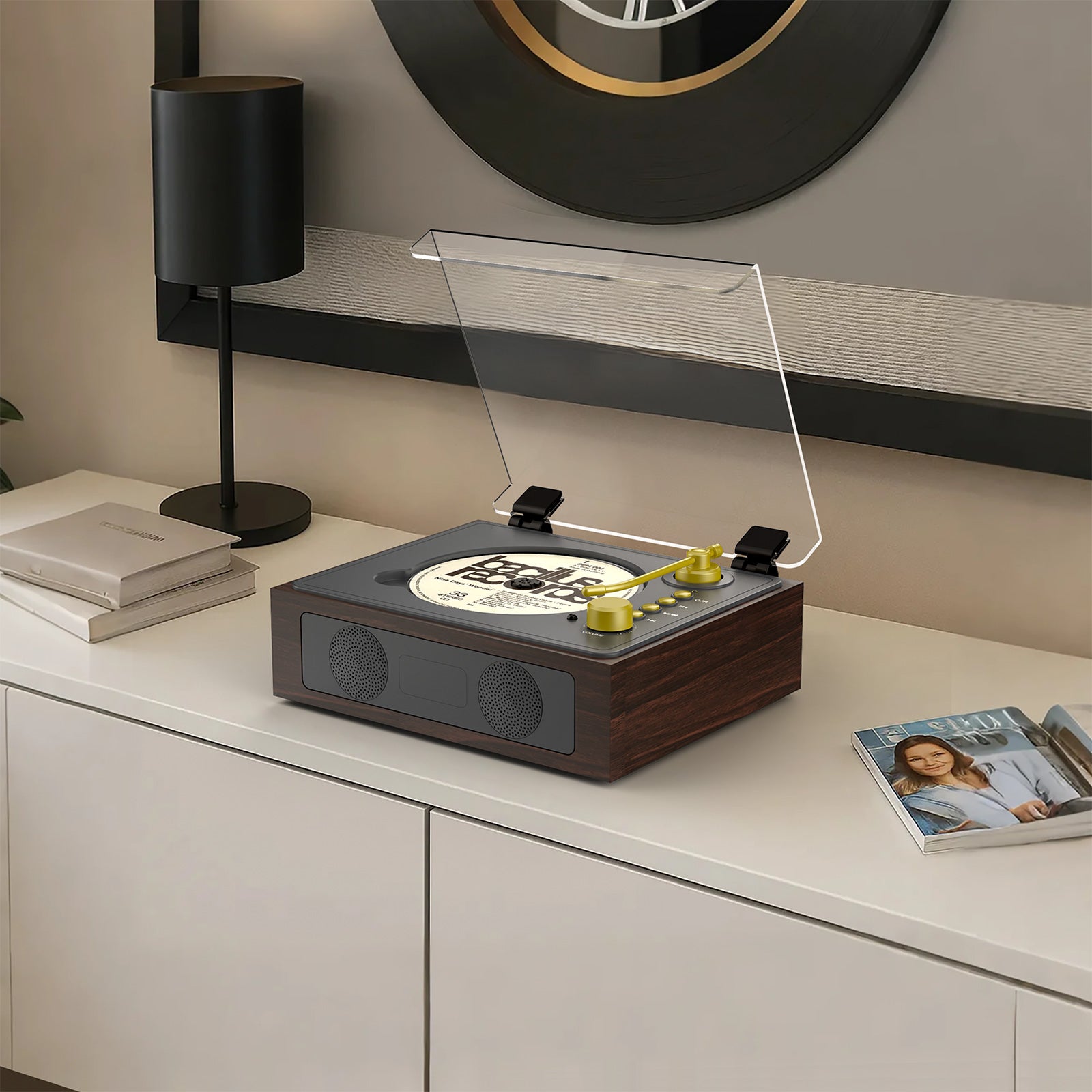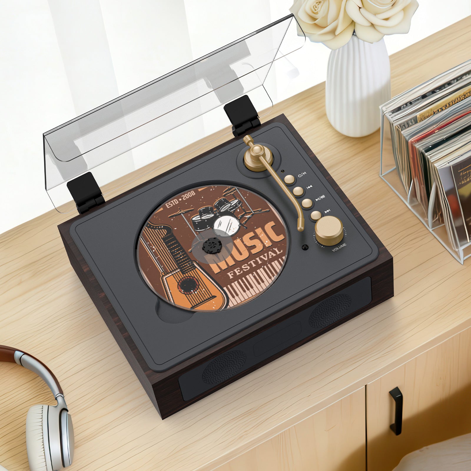 With a compact footprint and warm wood-tone design, this player feels right at home on a nightstand, shelf, desk, or side table. It’s small enough to fit anywhere, yet designed to be seen—not hidden.