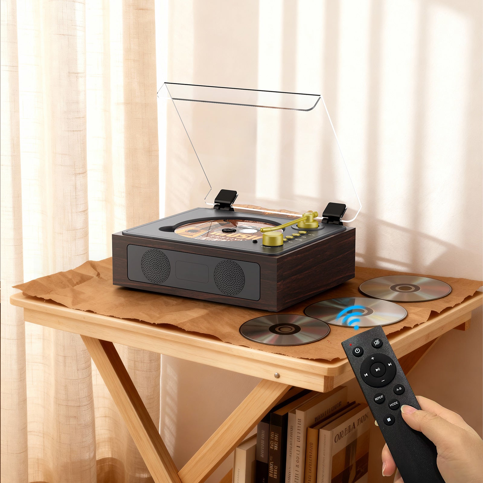 Inspired by vintage turntables, finished with a warm wood-tone look. - Wide CD Compatibility