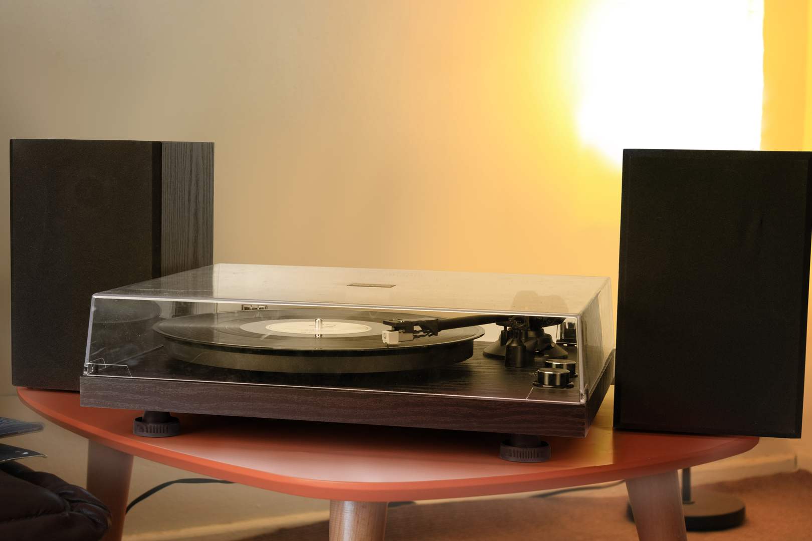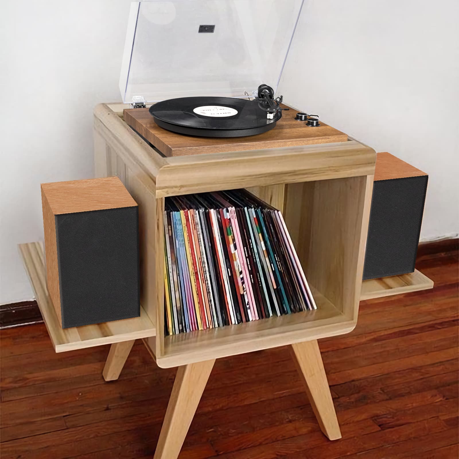 Elevate your music experience with the SY101 turntable and speakers on a dedicated vinyl collection table. This arrangement creates a stylish focal point in any music room, inviting you to immerse yourself in your favorite records.