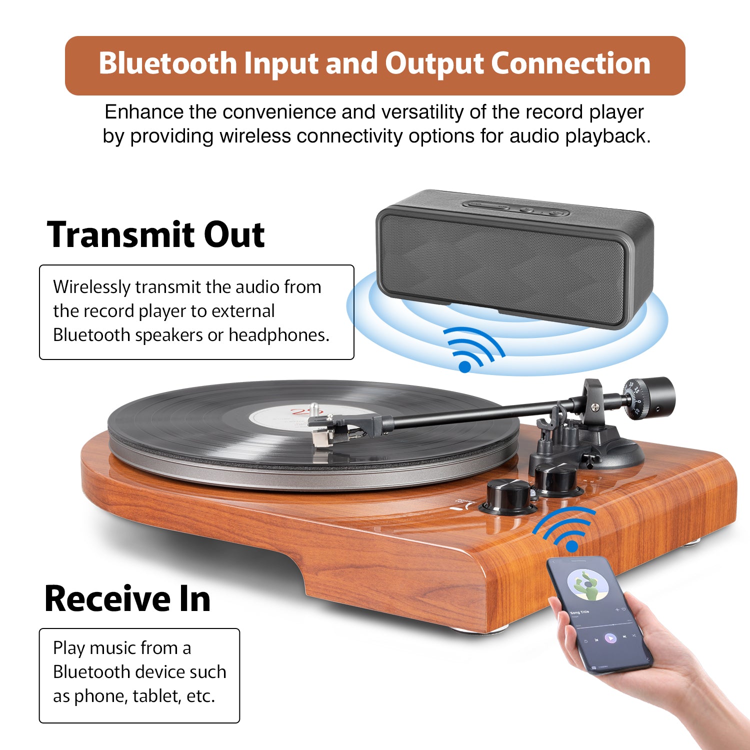 Easily toggle between PHONO (vinyl), Bluetooth input, and Bluetooth output with a simple button switch, making it user-friendly for beginners while meeting the demands of audiophiles.