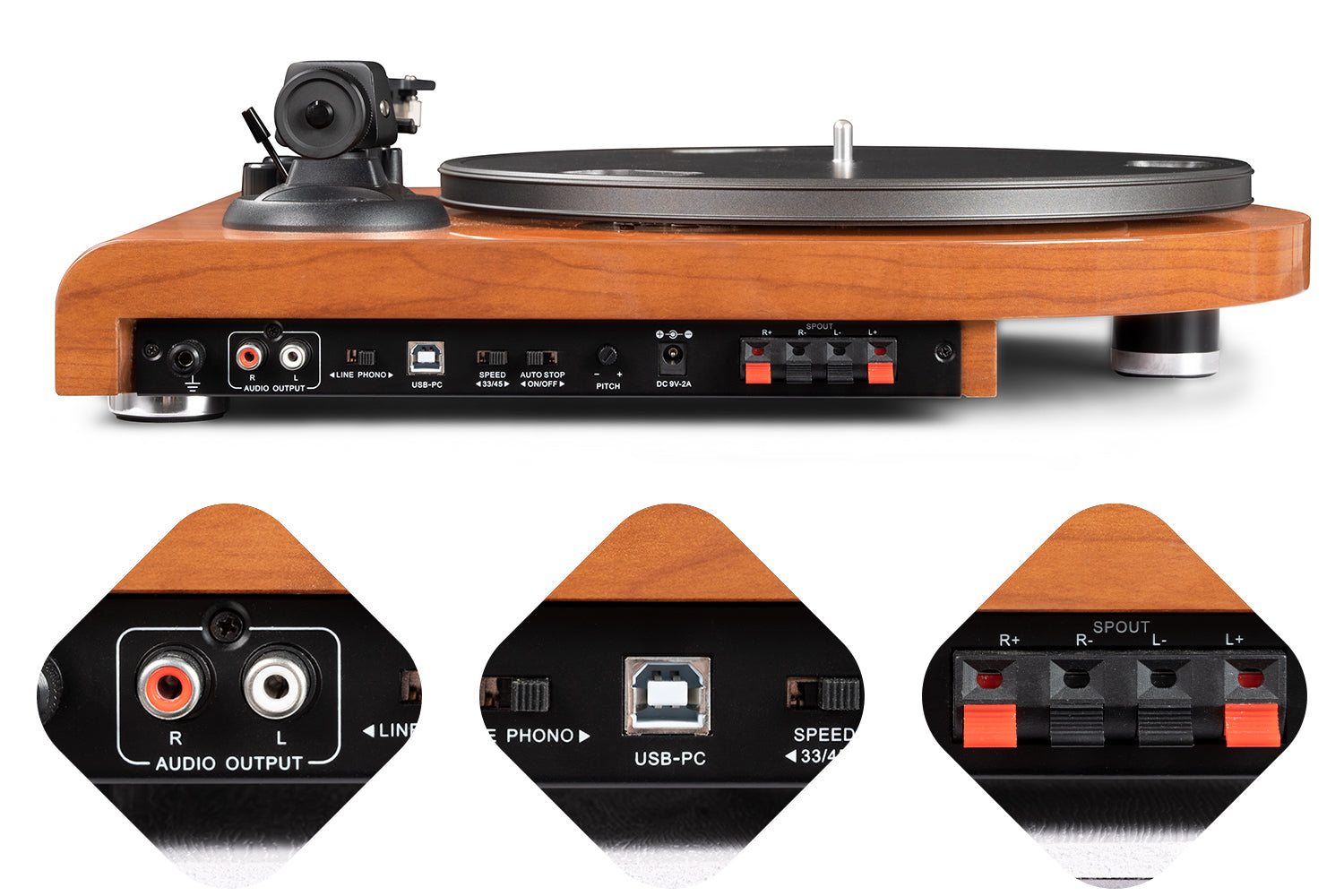 - Features a switchable Phono/LINE output with a built-in preamp, providing versatile connectivity options for your audio setup.