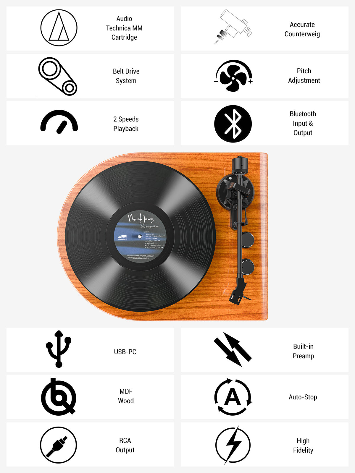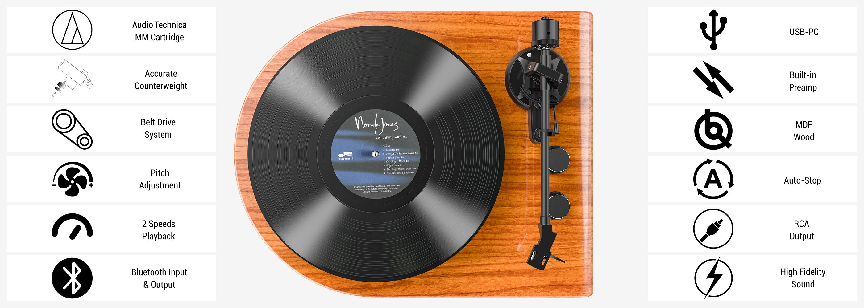 - An auto-stop function that automatically halts playback at the end of your records, preventing unnecessary wear and ensuring a longer lifespan for your vinyl.