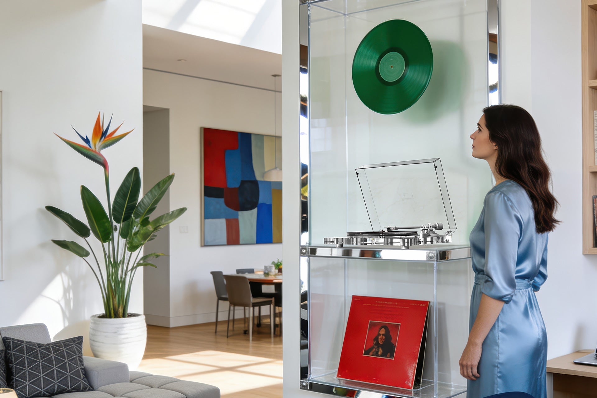 Fully transparent high-fidelity Bluetooth turntable with vibrant, rich sound — perfect for stylish, audiophile-quality listening.